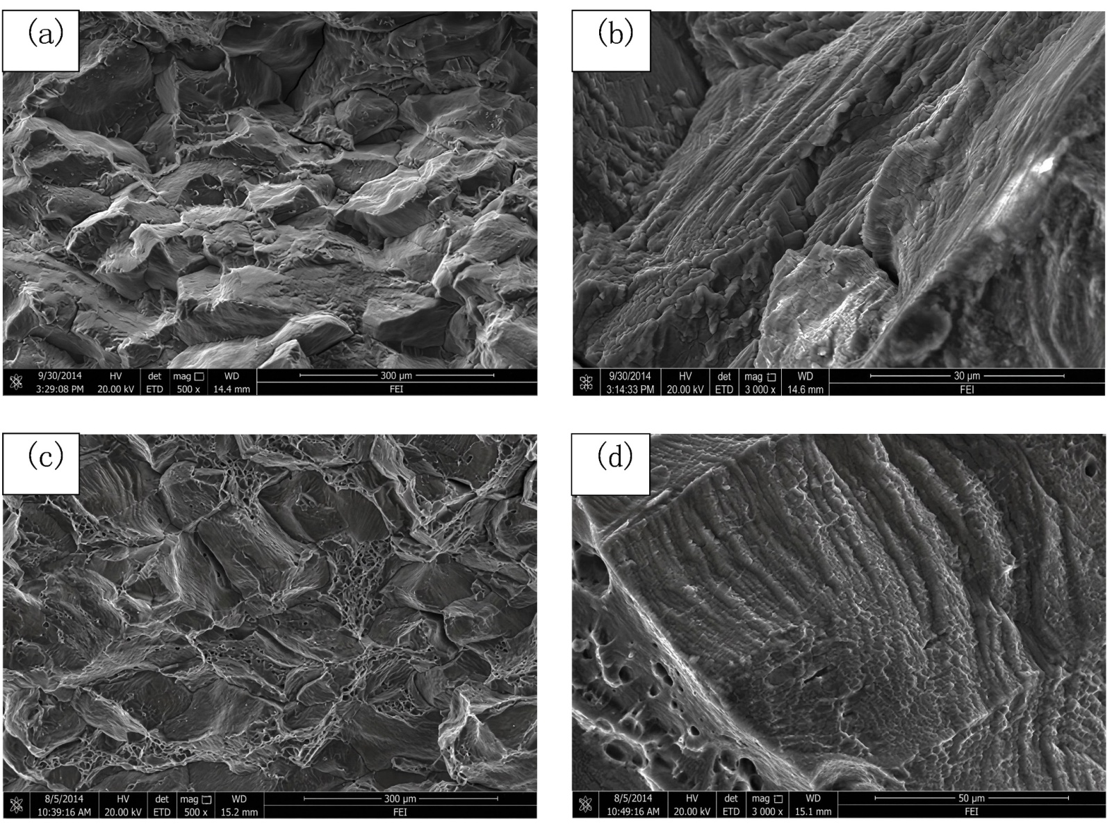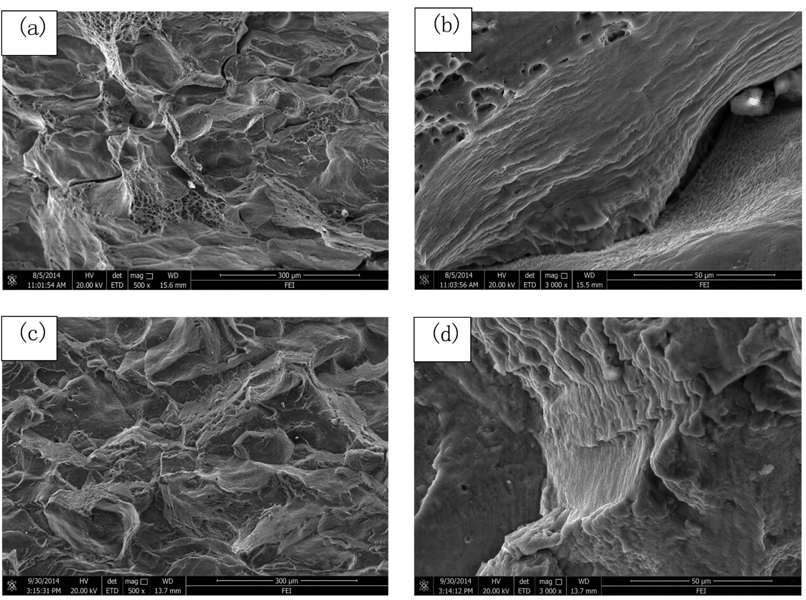 图11. 腐蚀疲劳裂纹扩展断口形貌:(a)、(b) 垂直轧制方向NaCl环境试样 (c)、(d) 垂直轧制方向空气环境试样
