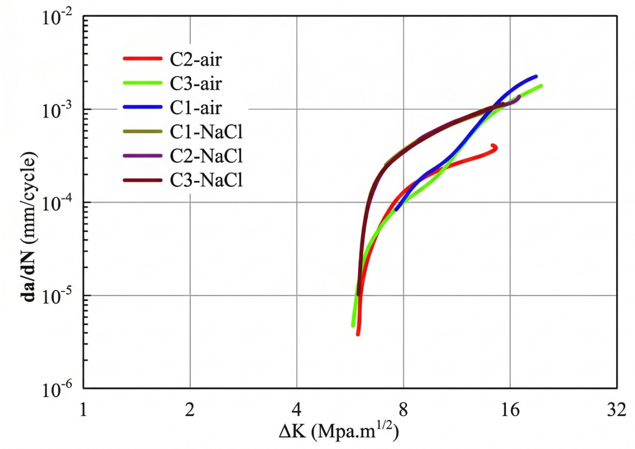 在NaCl溶液环境中,X向试样Paris常数C显著增大、指数m降低,ΔK = 10~20 MPa·m1/2区间的平均裂纹扩展速率为1.25 × 10−4 mm/次,是空气环境(1.52 × 10−5 mm/次)的8.2倍;裂纹扩展门槛值ΔKth从空气环境的3.8 MPa·m1/2降至NaCl溶液的2.1 MPa·m1/2,降幅约44.7%。