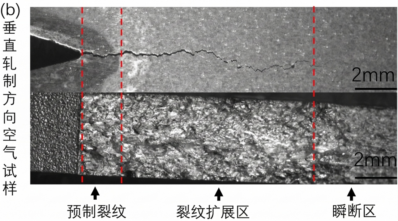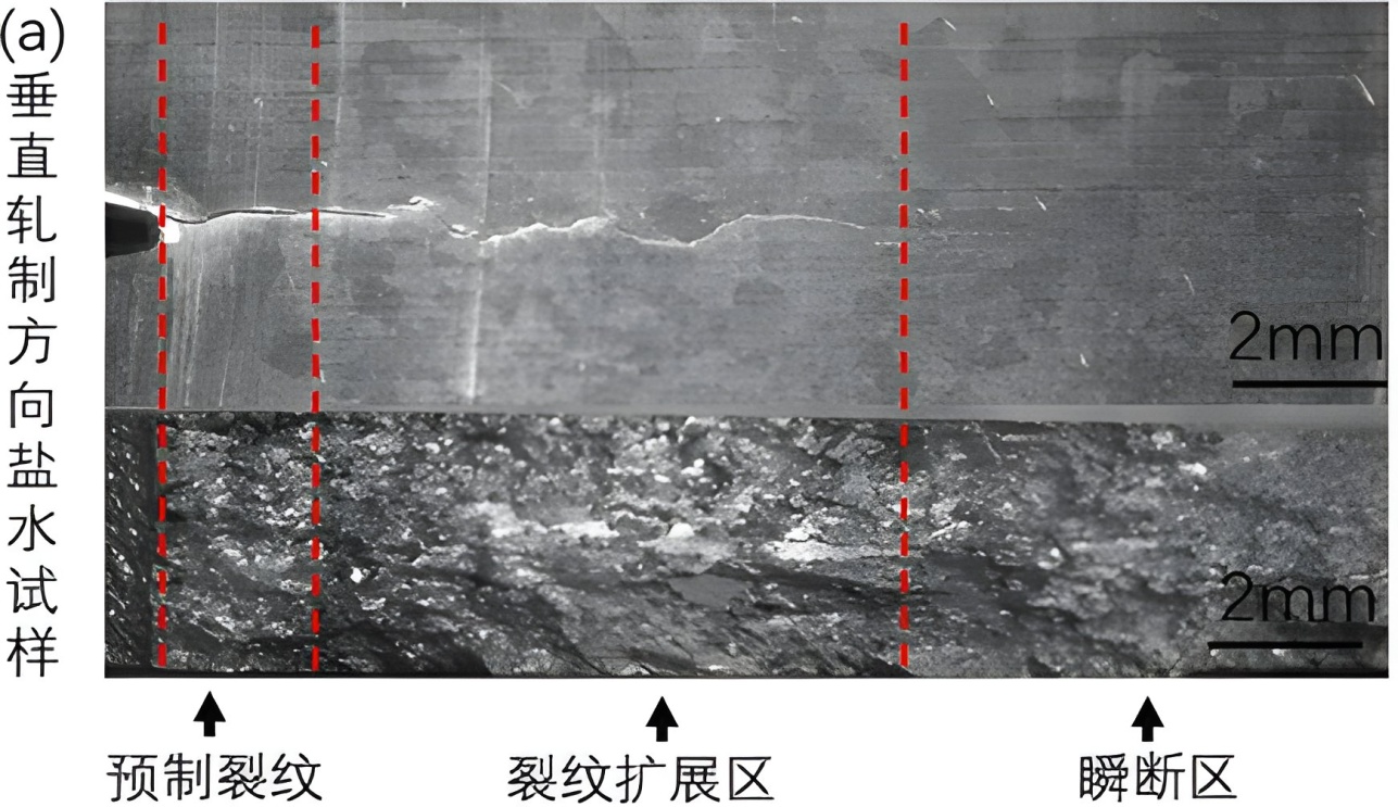 图10. 腐蚀疲劳裂纹扩展路径:(a) 垂直轧制方向NaCl环境试样 (b) 垂直轧制方向空气环境试样