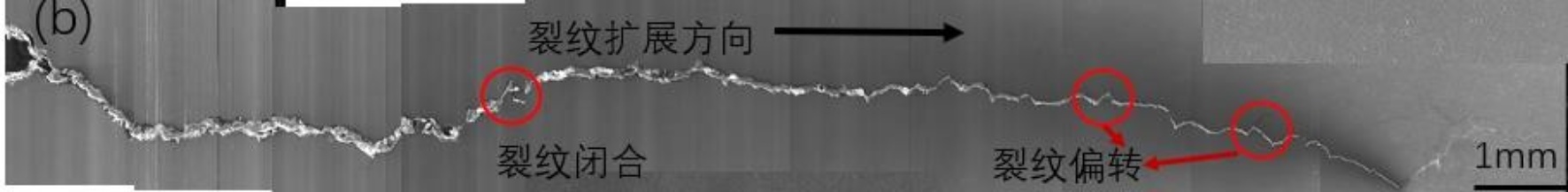 图6. 腐蚀疲劳裂纹扩展路径:(a) 平行轧制方向NaCl环境试样 (b) 平行轧制方向空气环境试样