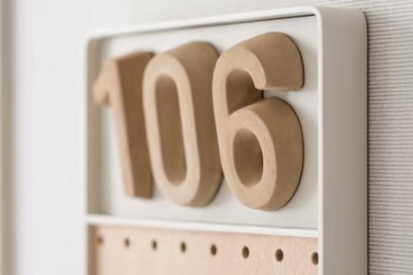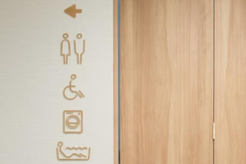 3. 布局与材质:标识的布局设计需要契合老年群体人体工学特征,标识安装高度控制在1.2~1.5米范围内,确保老年群体可平视查看,避免弯腰或仰头带来的行动不便与视觉不适。在材质选择上,主体应选取防滑、耐磨、环保的复合型材料,边缘需进行圆角处理,规避尖锐边角引发的磕碰伤害风险。例如,日本Abeyama养老院聚焦高龄、行动不便老年人的需求,打造了兼具功能性与人文关怀的导视系统。在细节设计上,房间标牌采用陶土与木材制作,倾斜式角度适配轮椅使用者与弯腰困难的老年人,木质肌理搭配柔和光源,营造温馨氛围(图2)。