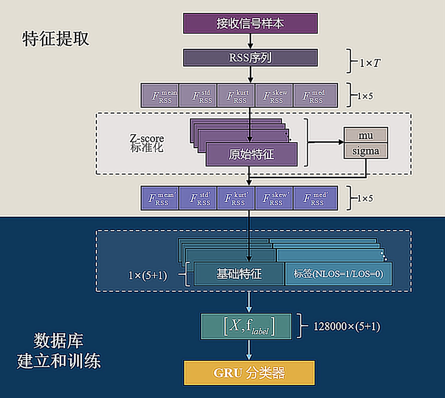 对于每个样本v,将其混合特征向量与其对应的标签连接起来,形成一个长度为5 + 1的训练样本。具体来说,前5个元素对应于从RSS序列导出的标准化特征,最后一个元素对样本标签进行编码。一旦处理了所有原始样本,就会生成一个包含V行和6列的标准化数据集,作为训练GRU的输入。图4说明了获取和提取RSS特征数据并将其准备用于模型输入的过程。