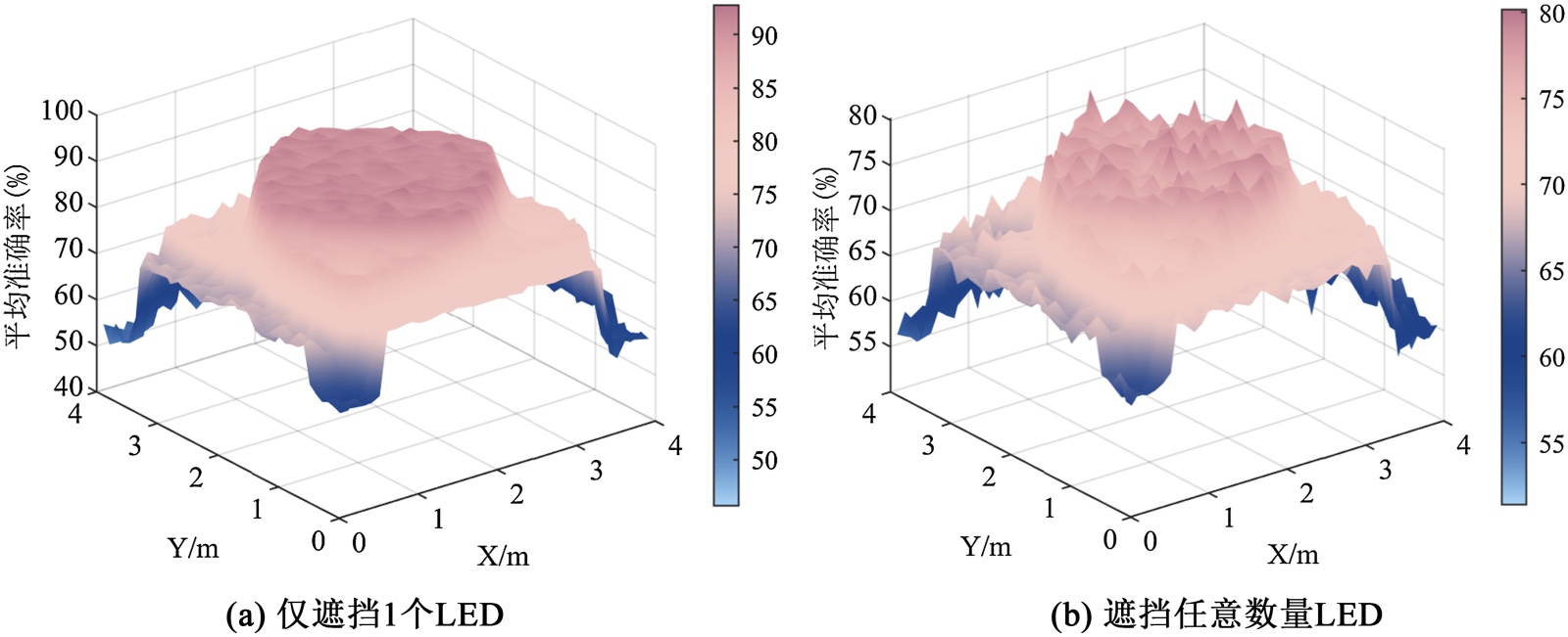 本实验设定随机遮挡场景下最多仅有1个LED处于NLOS状态(即系统中至少存在3个可靠的LOS信号),故保留前三个LOS概率最大的LED信号构建定位锚点集合