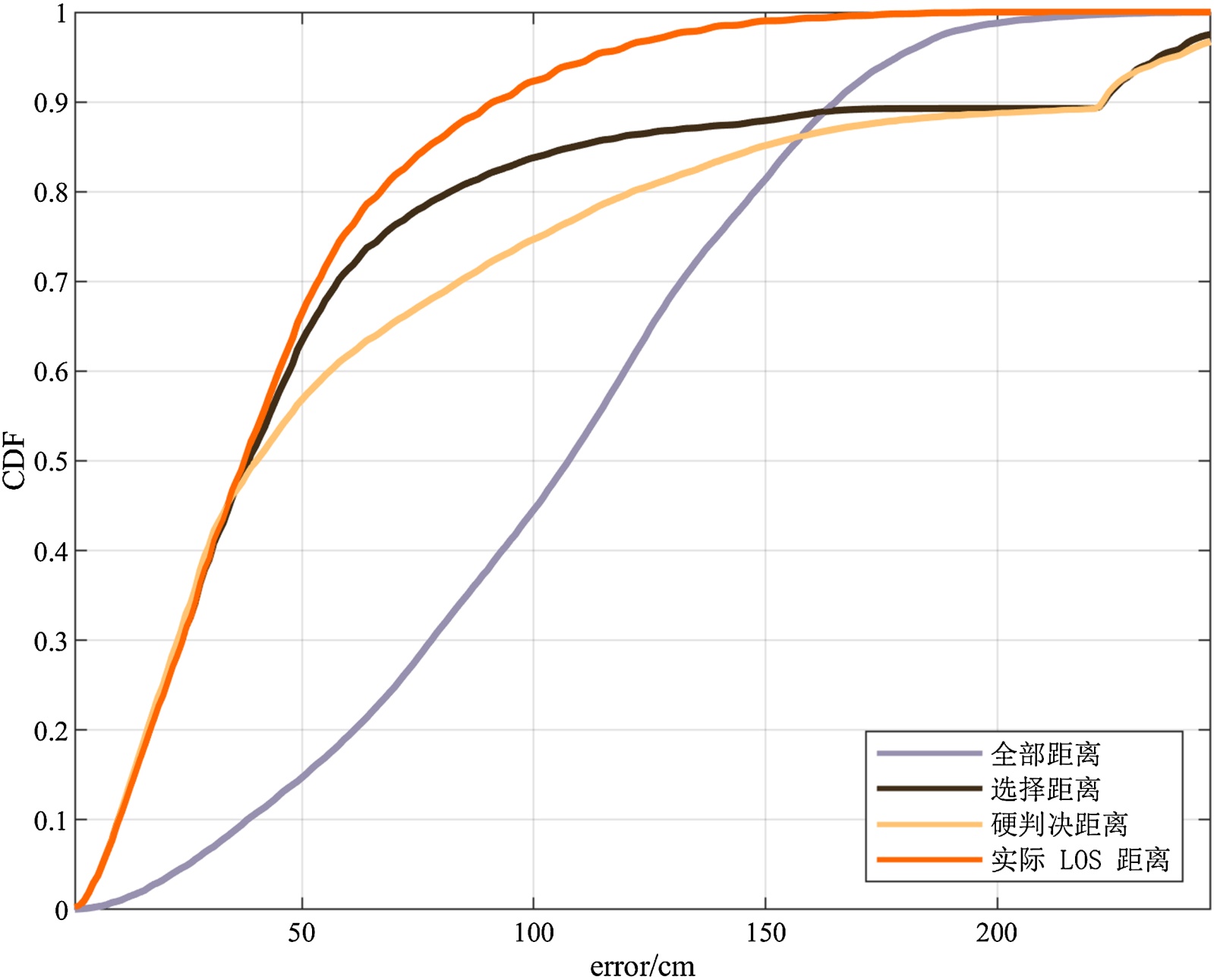 基准方法(Mean = 1.046 m, RMSE = 1.145 m),其平均误差降幅达40.7%,表明该策略能有效识别并剔除主要干扰源;同时,“选择LOS”性能亦全面超越基于二元分类的“硬判决LOS”方案(Mean = 0.716 m, RMSE = 1.016 m),证明概率排序机制相较于硬性阈值筛选可更充分保留有效信号、减少信息损失;尤为重要的是,“选择LOS”与理论最优的“实际LOS”(Mean = 0.447 m, RMSE = 0.554 m)差距极小,二者平均误差仅相差0.173 m进一步分析表明,“选择距离”策略通过引入概率排序机制,有效克服了硬判决方法因非黑即白分类导致的可用数据减少问题,在全误差范围内展现出更优的鲁棒性与覆盖完整性。