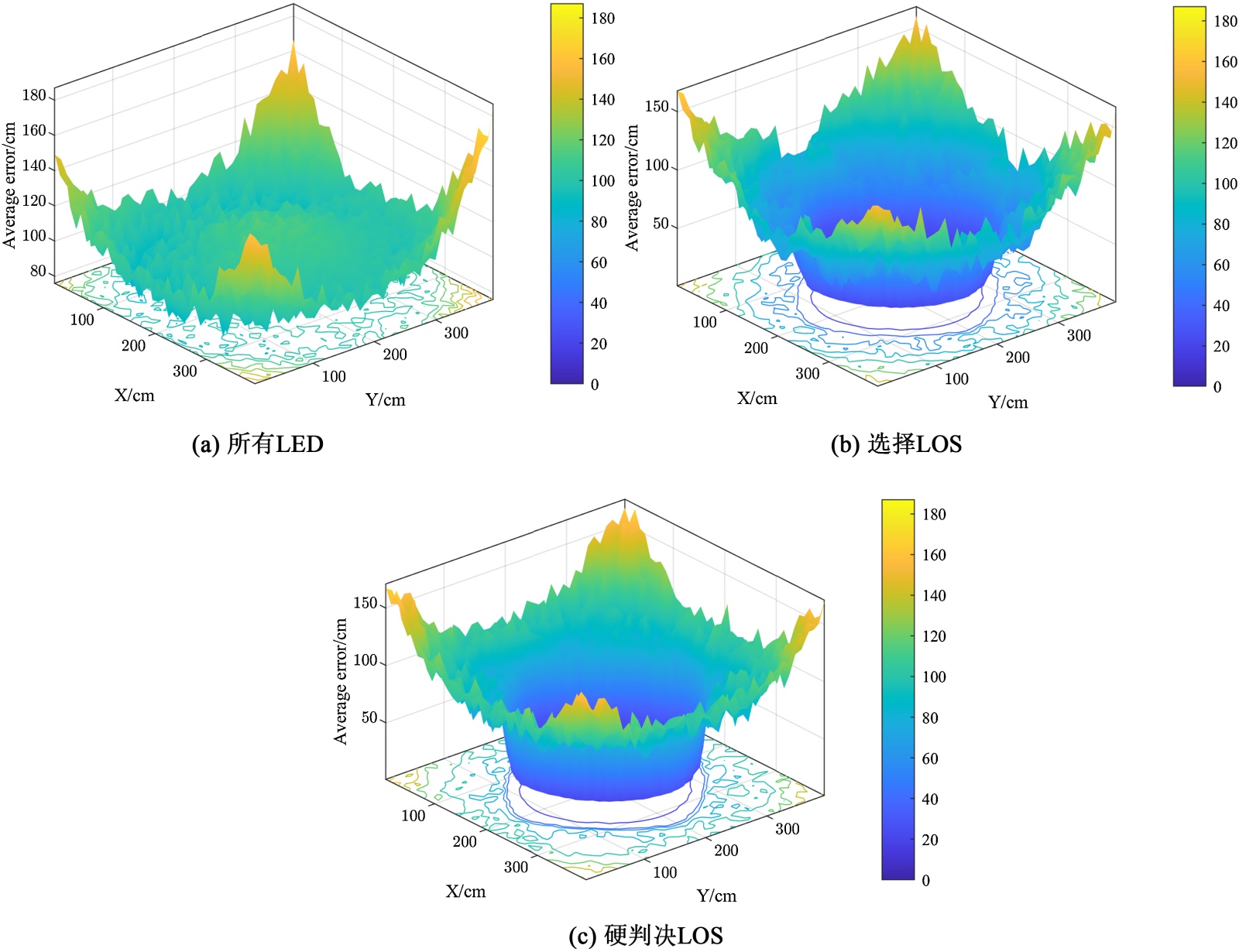 图7. 所有LED、选择LOS、硬判决LOS和实际LOS的平均误差3维分布图