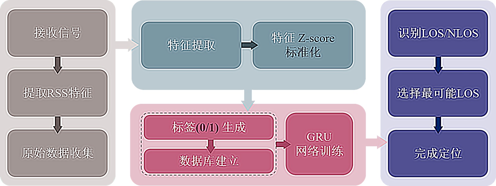 为克服上述局限性,基于机器学习的方法应运而生,其利用数据驱动模型捕捉更复杂的信号模式。经典机器学习模型,如利用到达时间差(TDOA)测量的支持向量机(SVM) [9]、结合接收信号强度(RSS)时间序列的最小二乘SVM和高斯过程模型[10],以及利用多个时域特征的随机森林分类器[11],均展现出优于传统方法的分类准确率。将SVM与模糊置信度度量或动态阈值相结合的混合策略进一步增强了鲁棒性[12]。尽管现有方法取得了一定进展,但仍存在一定的局限性。为此,本文提出了一种基于门控循环单元(Gated Recurrent Unit, GRU)的可见光LOS/NLOS识别与高精度室内定位方法。本文的创新之处在于构建了基于统计特征驱动的自适应分类模型,不再直接依赖原始时间序列的逐点递归处理,而是通过提取RSS时间序列的五个关键统计特征(均值、标准差、峰度、偏度、中位数)。这些特征能够有效表征NLOS信号在统计分布上的非高斯特性和波动规律,从而在保留时序核心信息的同时,显著降低了模型的计算复杂度与过拟合风险。进一步地,本文将训练好的GRU网络嵌入到可见光定位解算流程中,构建了一套“识别–去除–定位”的闭环系统,仅利用被识别为高置信度的LOS信号进行位置解算。通过在仿真环境中进行多场景、多动态干扰因素的验证,结果表明该方法不仅能以高准确率识别NLOS信号,还能将定位误差从传统方法的分米级降低至0.62 m,且在保证高精度的同时具有更优的实时推理效率和部署便捷性,为实现高可靠、低成本的室内可见光定位提供了一种新的技术途径。