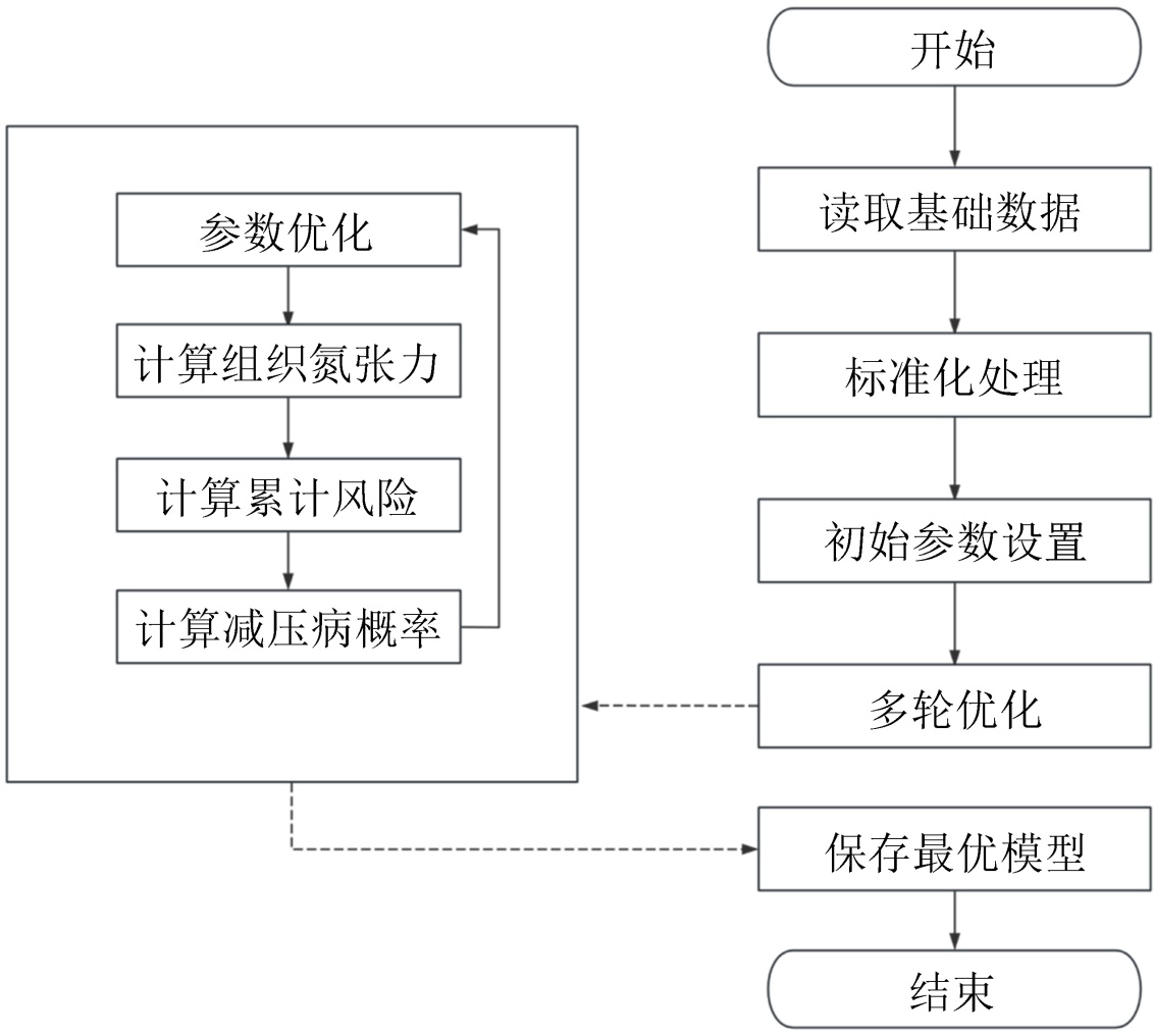 6) 模型保存:筛选出对数似然值最大的模型,使用已拟合的最优参数,计算每个潜水计划的DCS概率,将概率模型最优参数、预测DCS结果保存。