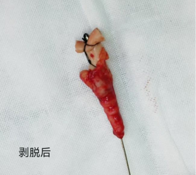 T型管改制大隐静脉剥脱器在基层医院大隐静脉高位结扎剥脱术中表现出显著的临床优势,可显著提升静脉剥脱完整率,减少手术切口、术中出血量和手术时间,同时降低术后隐神经损伤、血栓事件等并发症发生率,改善患者长期预后,尤其适用于大直径静脉曲张患者。其粗大管头对周围组织的潜在损伤风险可通过规范手术操作有效规避,且器械具有低成本、高效益的特点,为DRG/DIP付费模式下基层医院的可持续发展提供了新的技术路径,助力基层医疗资源合理分配。本研究成果为基层医疗机构提供了一种安全、经济、高效的治疗选择,对推动优质医疗资源下沉具有重要实践价值,具有显著的社会经济效益和广阔的应用前景。