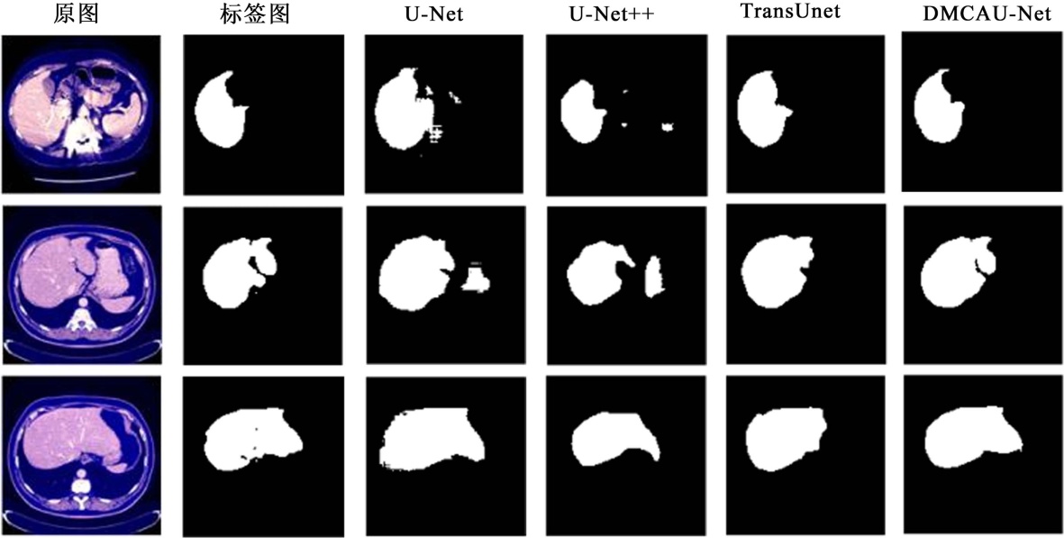 为验证本文提出的DMCAU-Net模型的有效性,在LiTS2017数据集上选取U-Net [3]、U-Net++ [10]、TransUNet [11]作为基准模型进行对比实验,实验结果如表2所示。