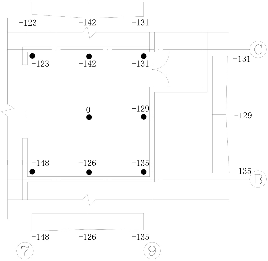 采用全站仪对地下室7-9/B-C轴区域底板的隆起情况进行测量,根据测量结果,房间中部相对四周的高差在123~148 mm之间(详见图5),中部隆起现象较为明显。