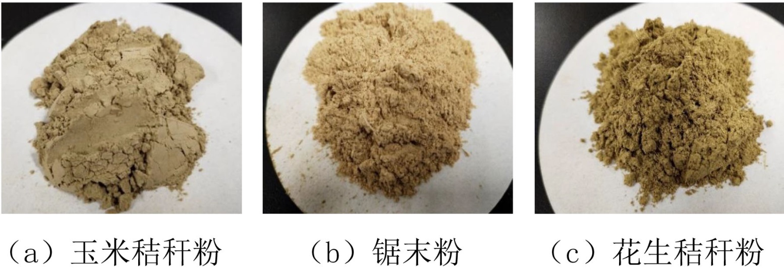 实验选择的生物质主要为玉米秸秆、锯末和花生秸秆,均为农业和林业废物。将选择的生物质原料放置在干燥箱中,设定干燥箱温度为105℃,烘干时间为12 h,再应用粉碎机将烘干的样品粉碎,再用100目的金属筛振筛进行筛选,得到不同生物质粉[3]。生物质粉如图1所示。