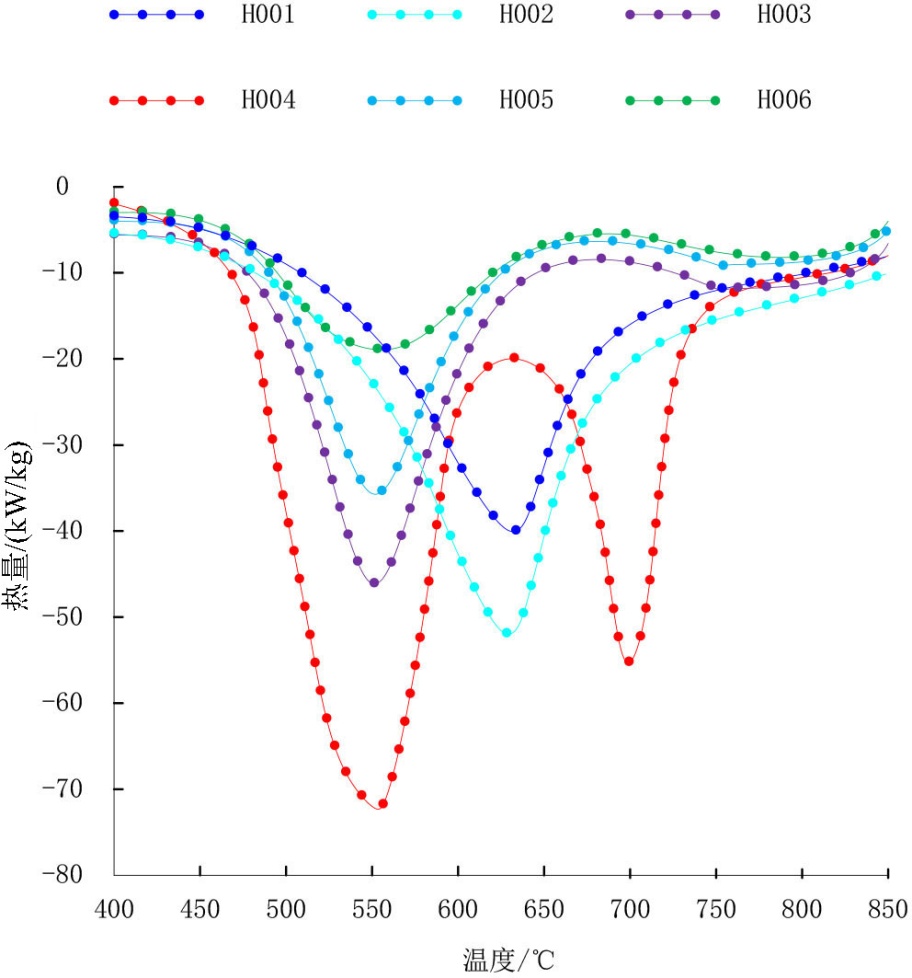 如图5所示,在该热量释放曲线中,可以明显看出,H004组有着两个明显的热量析出峰,第一个峰由生物质焦燃烧放热所致,第二个峰则由固体焦炭燃烧引起,其第一个峰热量析出为72.25 kW/kg。第二个峰的热量析出为55.67 kW/kg,总热量析出为127.92 kW/kg。这是因为生物质焦能有效提升烟煤的燃烧效率,既减少前期热量损失,又避免后期燃烧不充分,从而有效提高混合燃料的能量输出。与之相比,两组空白对照组的热量析出均不高,H001是受到烟煤燃烧不充分的影响,H006组则是由于生物质焦本身的热量析出较低。