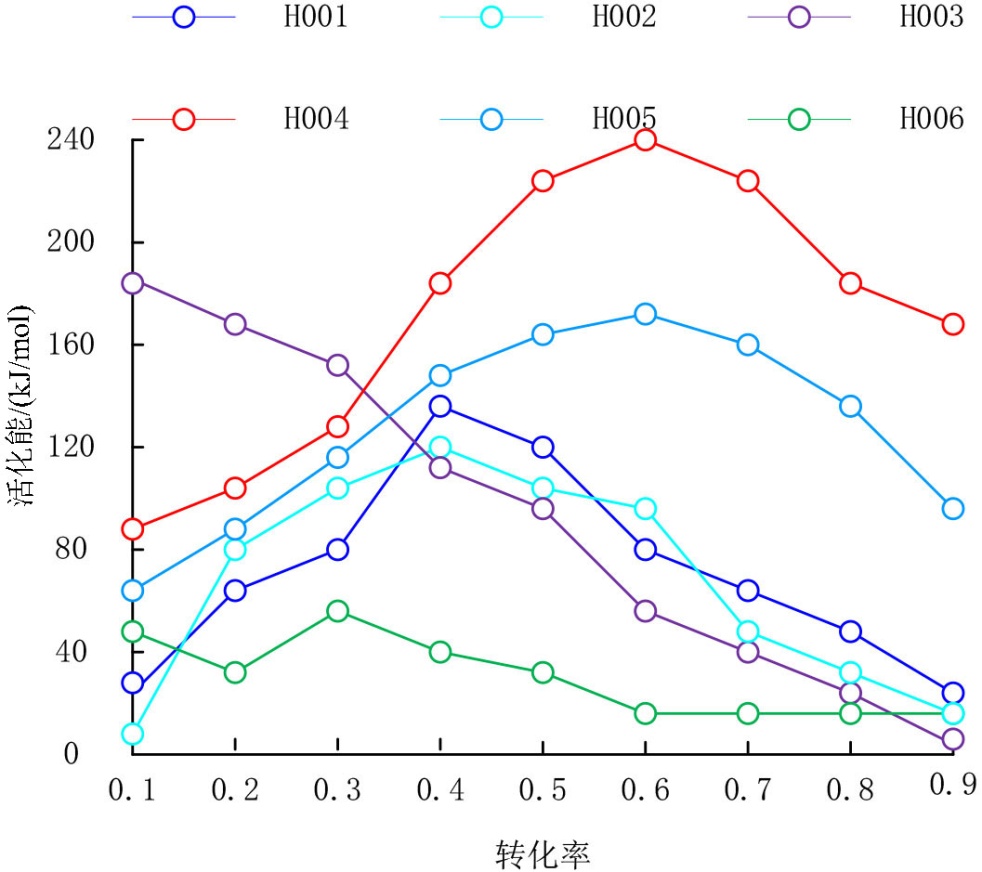 由此可见,H004实验组的活化能数值最大,为249.29 kJ/mol。