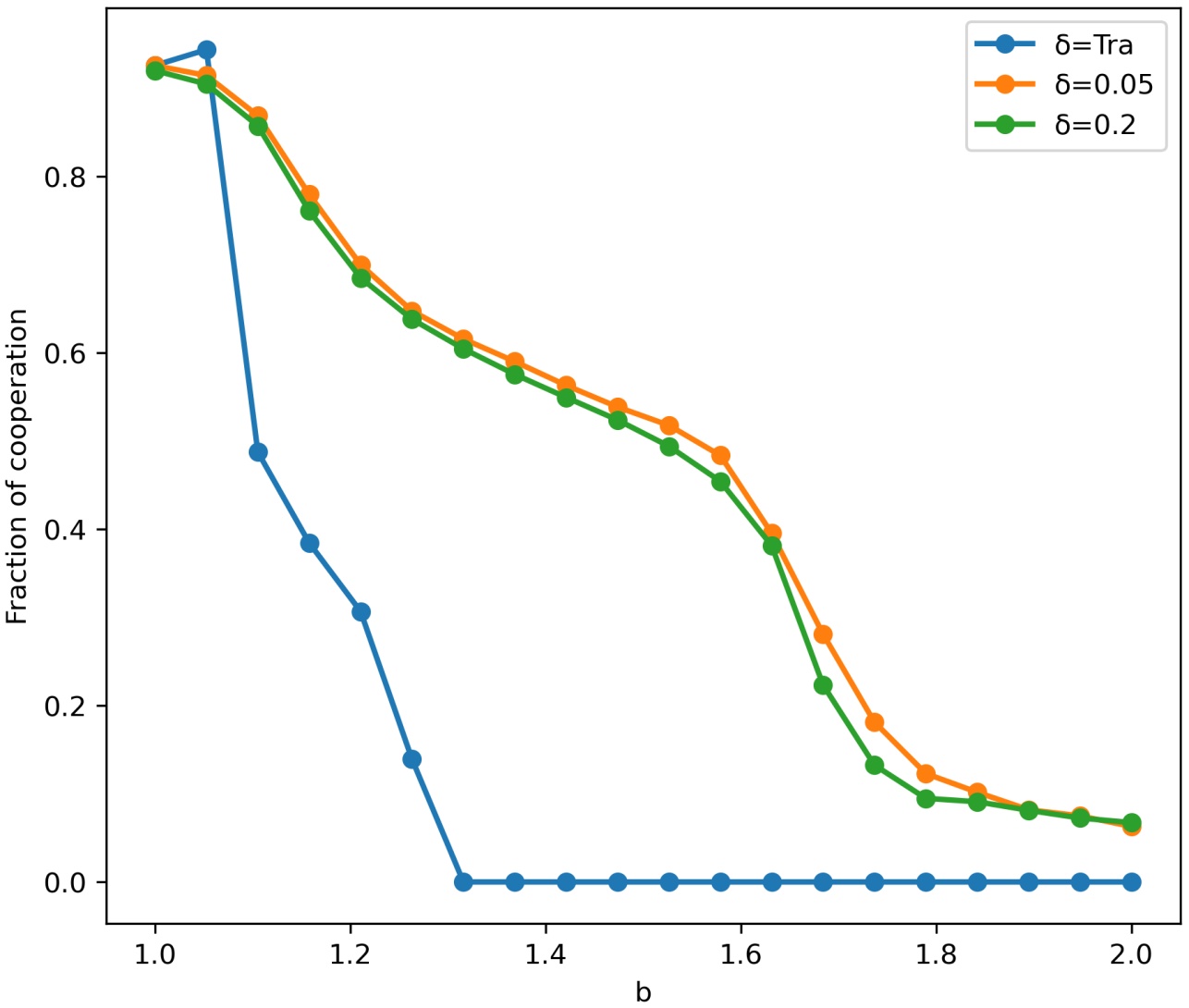 超过该区间后,合作稳定性迅速降低,甚至在较大
