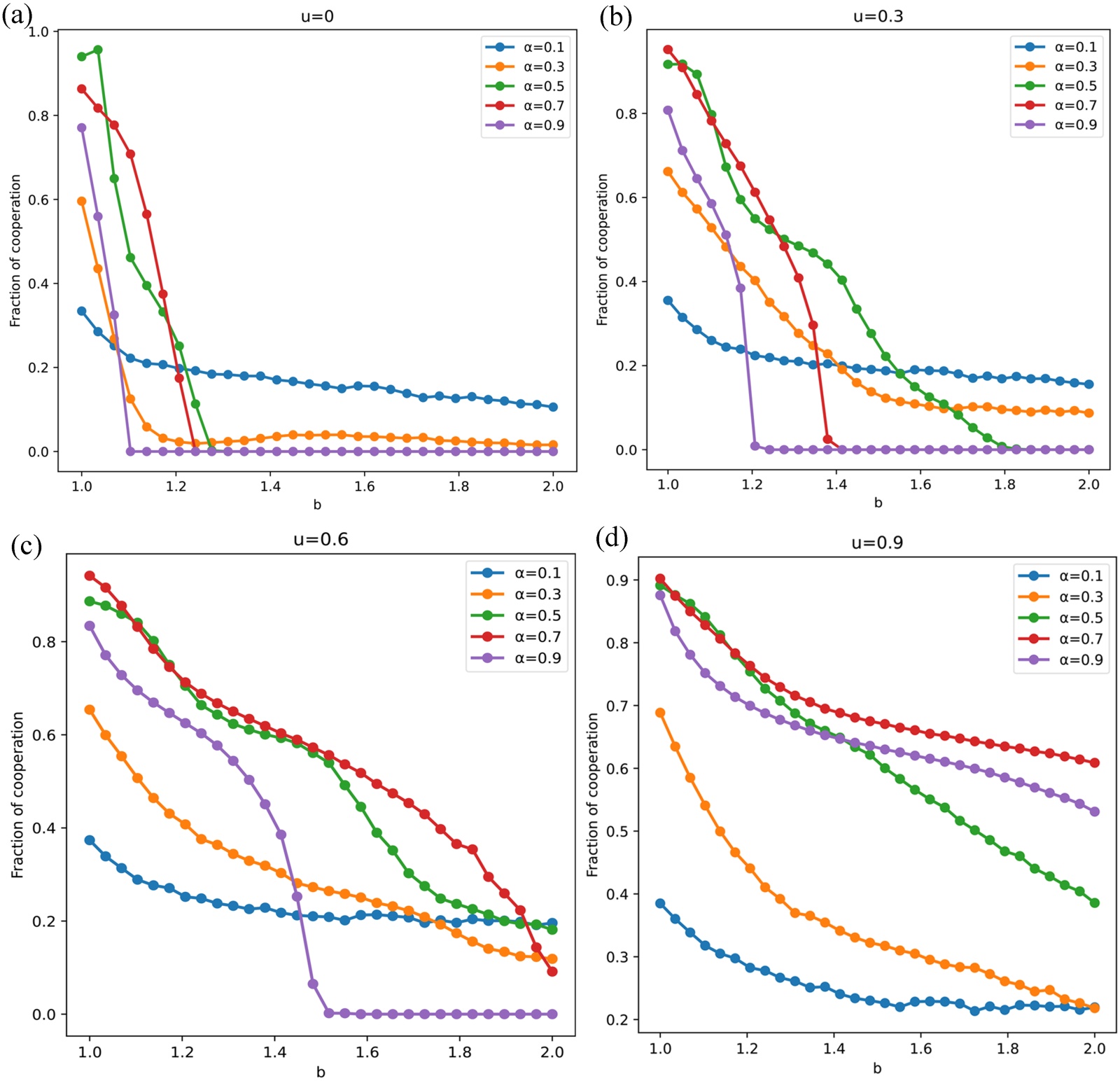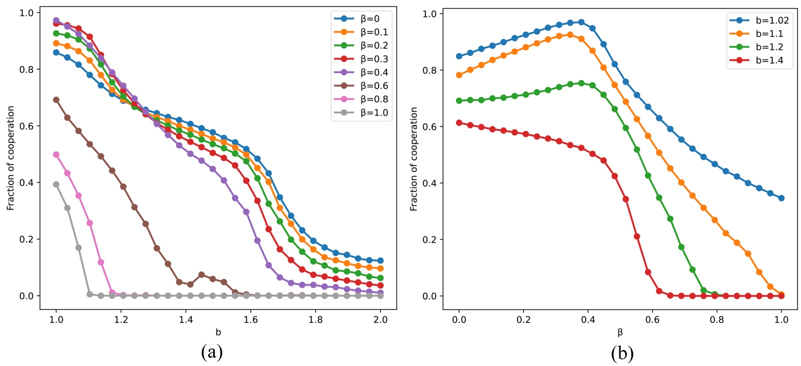Figure 4. Panel (a) shows the variation of the fraction of cooperator with the temptation to defect b under different aspiration sensitivities