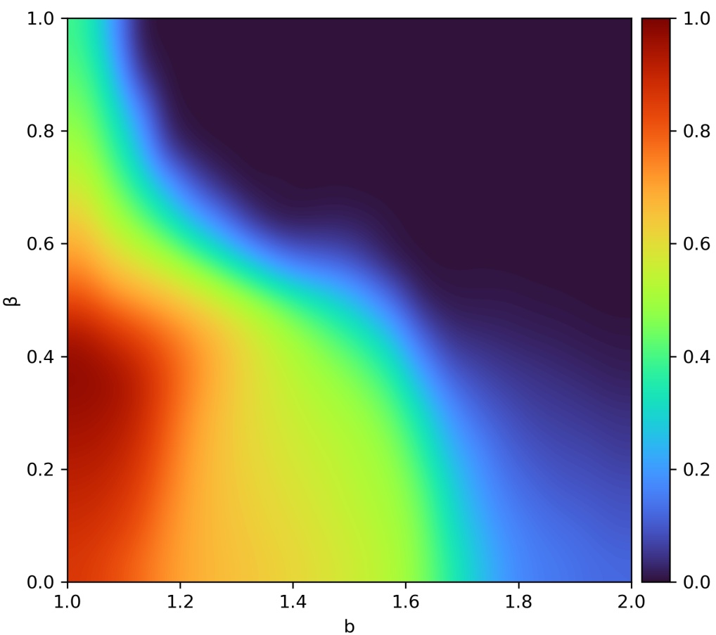 Figure 5. Variation of the fraction of cooperators under the combined effects of the parameters β and b