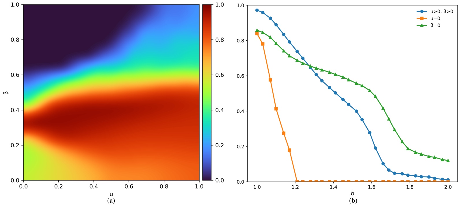 Figure 6. Panel (a) shows the fraction of cooperator for different combinations of u and β; Panel (b) presents a mechanism-isolation comparison along the b direction