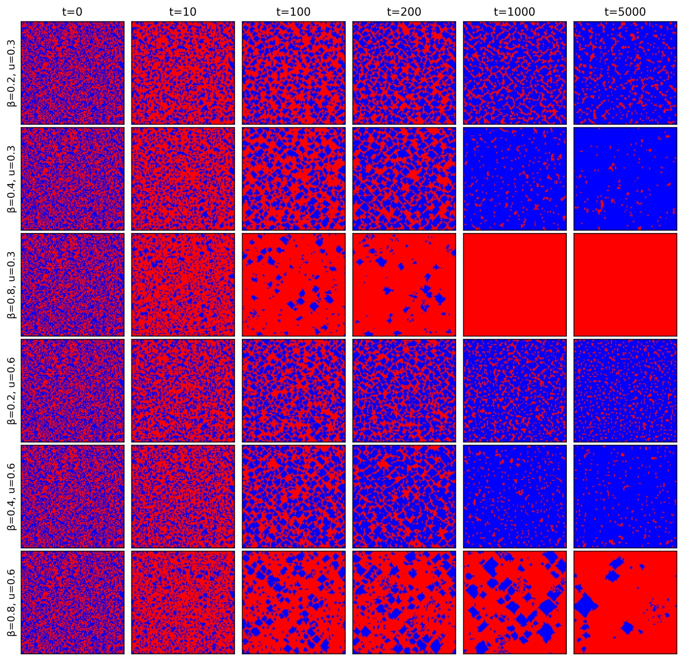 参数组合下系统的空间演化呈现出显著差异。蓝色与红色分别表示合作者与背叛者。当