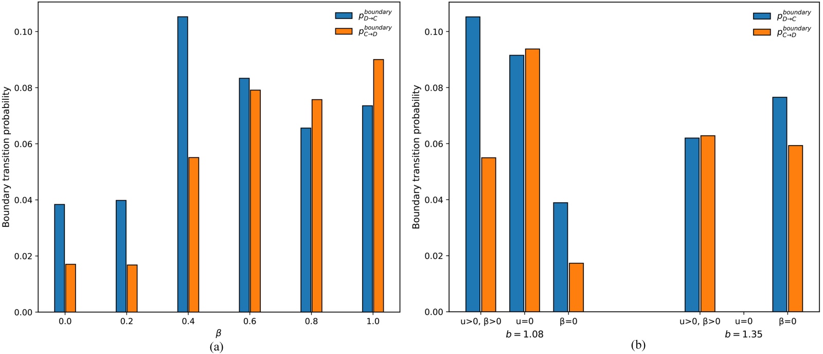 Figure 8. Panel (a) shows the boundary transition probabilities; Panel (b) presents a mechanism-isolation comparison at