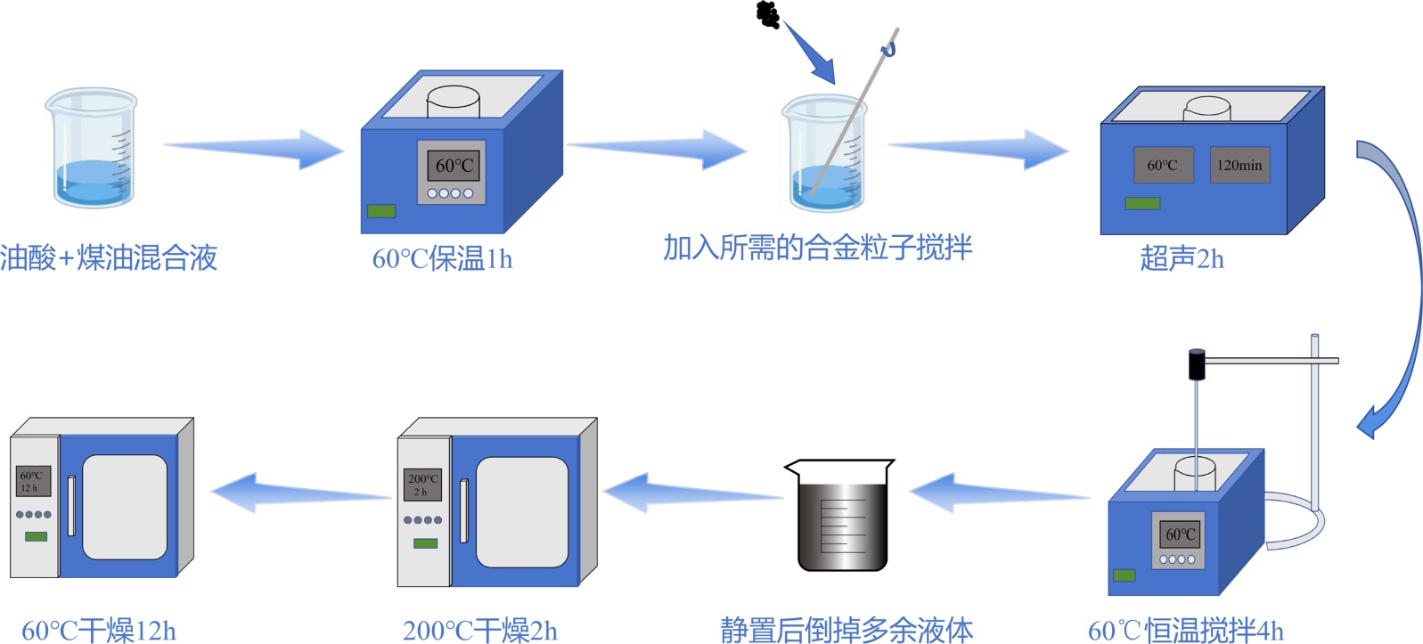 如图1,将油酸与煤油按体积比2:1混合、搅拌均匀,置于60℃水浴中保温30分钟。将制备的合金粒子缓慢加入该溶液中,随后用玻璃棒手动搅拌30分钟,以初步打散团聚体,确保粒子充分浸润。然后将混合体系转移至KQ-100型超声波清洗器中,于60℃下超声处理2 h,使合金粒子充分分散。再移入HH-1型数显恒温水浴锅中,在60℃下机械搅拌4 h,使油酸分子在粒子表面完成充分吸附与包覆。随后停止搅拌待溶液静置值室温后倒掉多余的液体。再放入DZF-6050型真空干燥箱内,在200℃恒温下真空干燥2 h,再于65℃下真空干燥12 h,对干燥好的样品手动研磨2h,最终获得表面改性的、分散性良好的合金粒子。Fe基粉末遇水易氧化生锈,油酸包覆全程需保持器具干燥,体系无水残留。