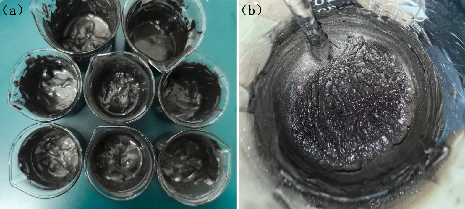 图2. 制备的磁流变液(a) 未加磁性状态,(b) 加磁性状态