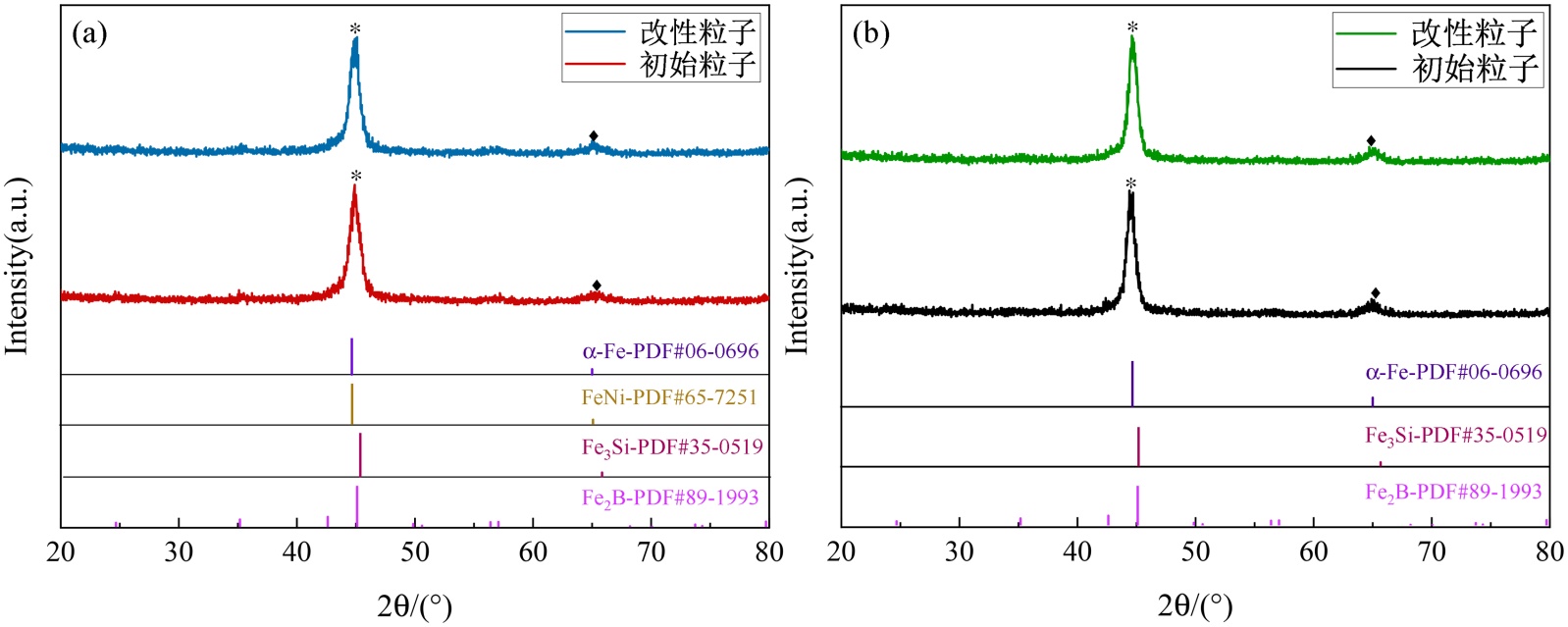 Figure 3. XRD spectra of the initial particles and modified particles (a) Fe70Ni12B14Si4 powder, (b) Fe82B14Si4 powder