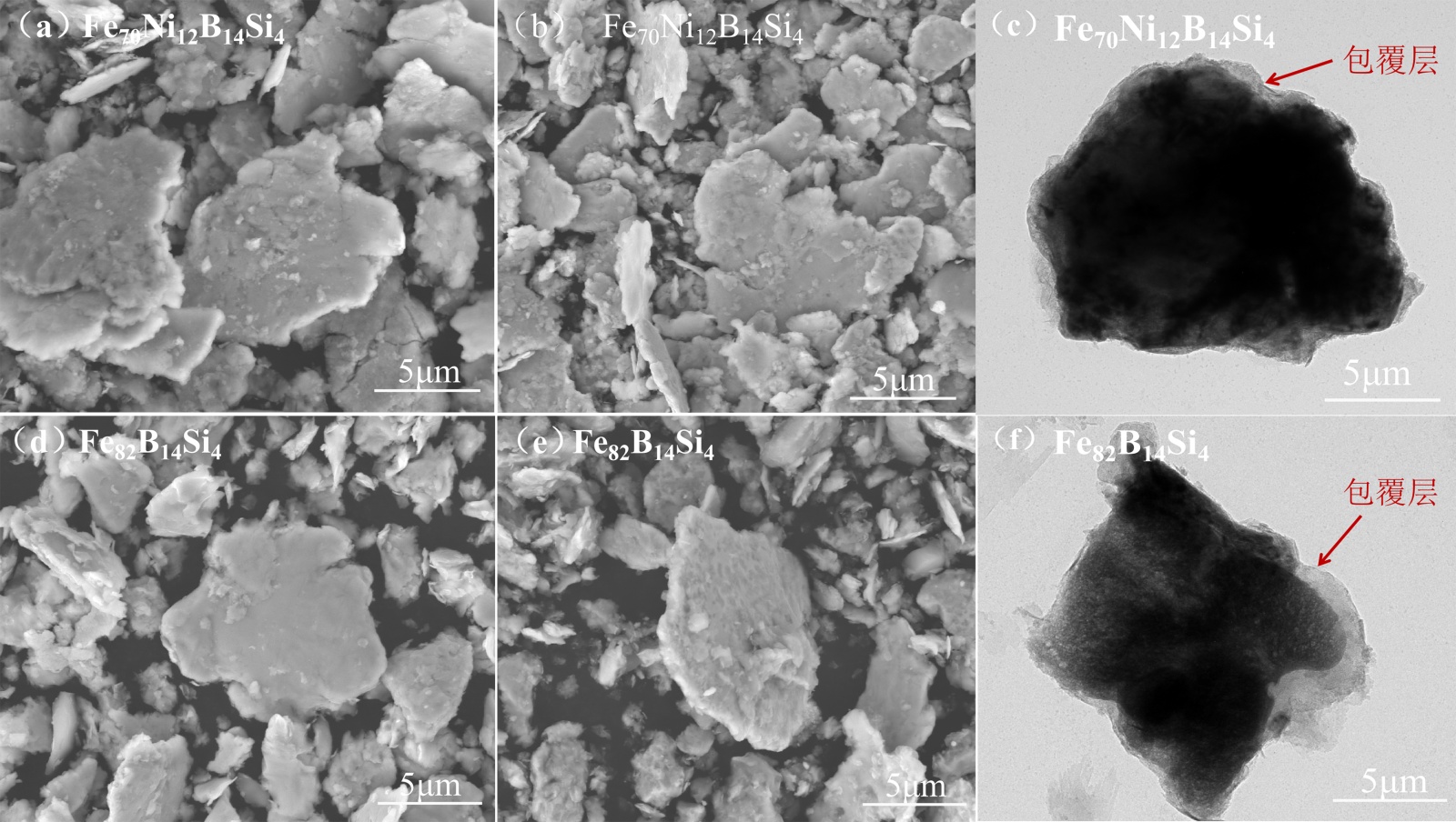 图4. 合金粒子SEM及TEM图(a) Fe70Ni12B14Si4初始粒子形貌,(b) Fe70Ni12B14Si4改性粒子形貌,(c) Fe70Ni12B14Si4改性粒子TEM;(d) Fe82B14Si4初始粒子形貌,(e) Fe82B14Si4改性粒子形貌,(f) Fe82B14Si4改性粒子TEM