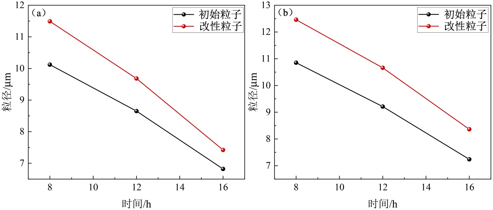 图5. 不同球磨时间下合金粒子的粒径(a) Fe70Ni12B14Si4合金粒子,(b) Fe82B14Si4合金粒子