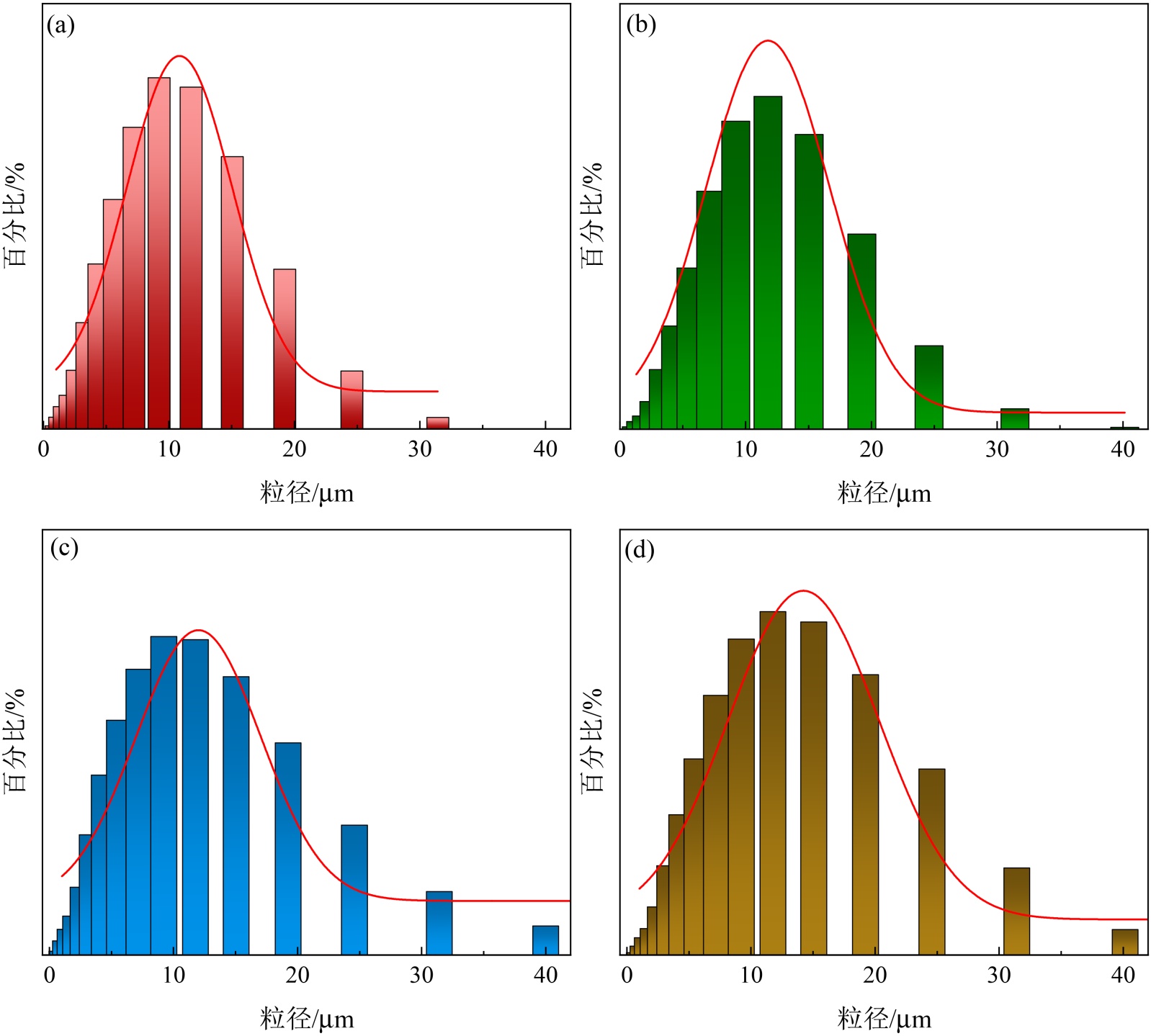 图6. 球磨8 h时,合金粒子的粒径分布(a) Fe70Ni12B14Si4初始粒子,(b) Fe70Ni12B14Si4改性粒子,(c) Fe82B14Si4初始粒子,(d) Fe82B14Si4改性粒子