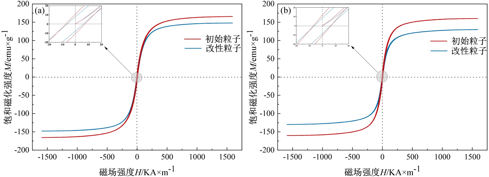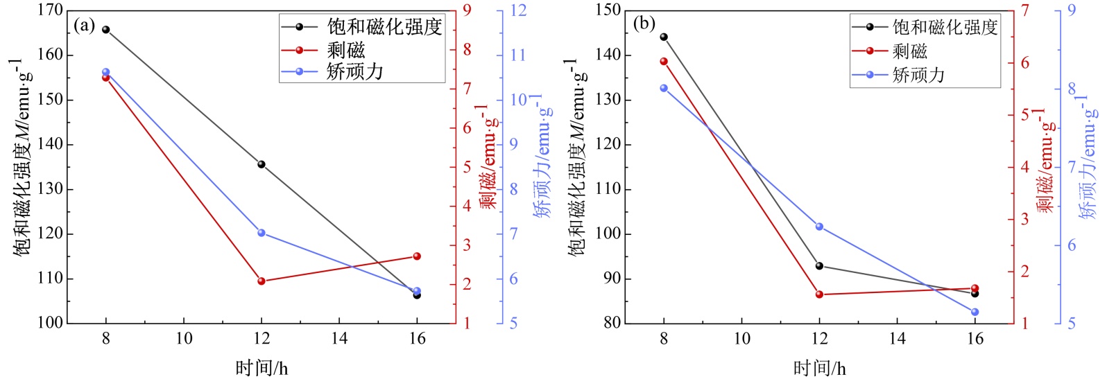 为探究磁性粒子的磁性能,采用VSM对不同球磨时间下表面改性前后的Fe70Ni12B14Si4与Fe82B14Si4两种合金粒子进行测试。根据图7可知,不管是初始粒子还是改性粒子,球磨时间为8 h的磁性能均高于球磨时间为12 h和16 h的合金粒子,且球磨时间越长,机械破碎作用越充分,粒子粒径越小。磁性粒子粒径减小时,粒子比表面积显著增大,表面原子占比升高。表面原子的磁矩因缺乏相邻原子的磁交换耦合,呈无序排列状态,导致有效磁化原子数减少,宏观上表现为Bs和Br下降。微观晶粒尺寸约为5 nm,属于单畴晶粒。但宏观团聚体尺寸减小会导致晶粒间界面增多,界面处原子磁矩同样无序,进一步削弱整体磁矩耦合,导致Bs下降。当球磨时间为8 h时,Fe70Ni12B14Si4粒子的测试结果如图8(a)所示,初始粒子其Bs、Br和Hcb分别为165.78 emu/g、7.29 emu/g和10.63 kA/m,经表面改性后,Bs、Br和Hcb