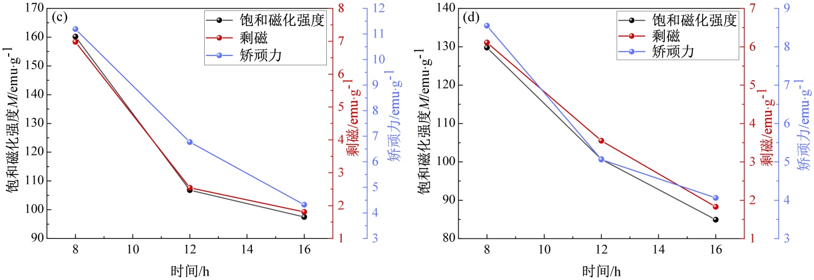 图7. 不同球磨时间改性前后粒子的磁性能(a) Fe70Ni12B14Si4初始粒子,(b) Fe70Ni12B14Si4改性粒子,(c) Fe82B14Si4初始粒子,(d) Fe82B14Si4改性粒子