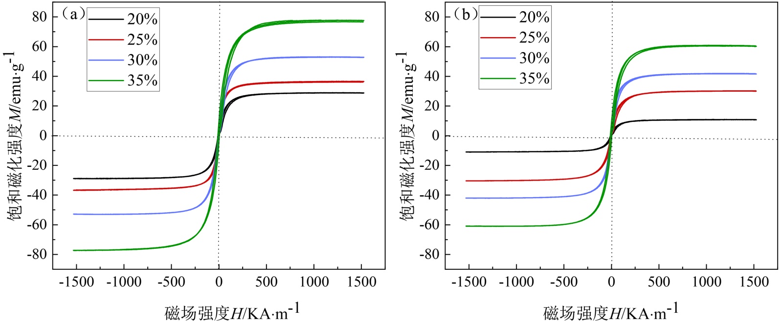 图9. 不同磁性粒子含量的磁性能(a) Fe70Ni12B14Si4磁流变液,(b) Fe82B14Si4磁流变液