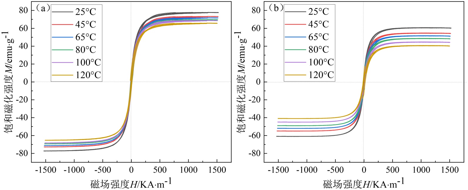 图10. 磁性粒子含量为35%时磁性能随温度的变化(a) Fe70Ni12B14Si4磁流变液,(b) Fe82B14Si4磁流变液