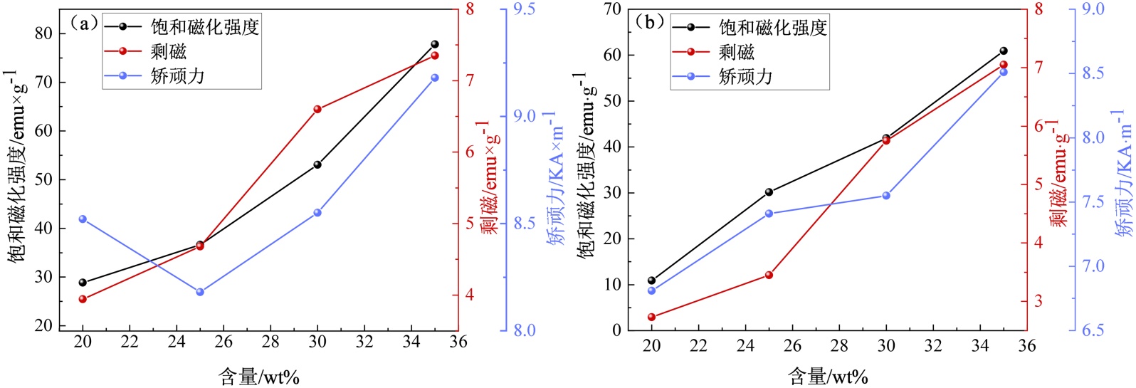 Figure 9. Magnetic properties of different magnetic particle contents: (a) Fe70Ni12B14Si4 magnetic fluid, (b) Fe82B14Si4 magnetic fluid