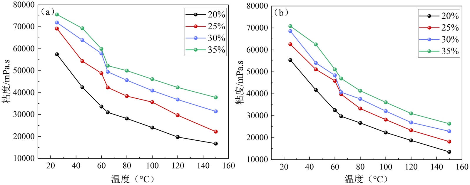 图12. 不同合金粒子含量的粘度随温度的变化(a) Fe70Ni12B14Si4磁流变液,(b) Fe82B14Si4磁流变液
