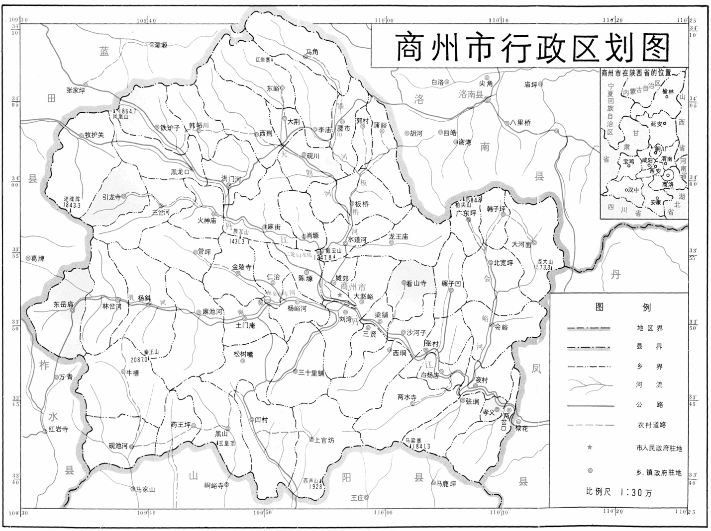 商州市位于陕西省东南部,秦岭东段南侧,丹江上游。介于北纬33˚38'~34˚11',东经109˚30'~110˚14'之间。东与丹凤县毗邻;南与山阳县接壤;西以秦岭山脉为界,与蓝田、柞水二县相连;北与洛南县相接。县城距丹凤县城51公里,距山阳县城62公里,距洛南县城72公里,距柞水县城(经红岩寺)146公里,距蓝田县城88公里,距省会西安137公里。属北暖温带南缘,以中、低山脉为主体的土石山区。因地近古都长安,东有武关天险可据,西有尧簣要区可依,自古以来乃兵家必争之地。今有312国道自西而东横贯全境,沟通豫陕襄汉。又有商(州)洛(南)、商(州)山(阳)、商(州)柞(水)等公路与周围各县相通,是陕东南的重要门户和交通枢纽[5]。