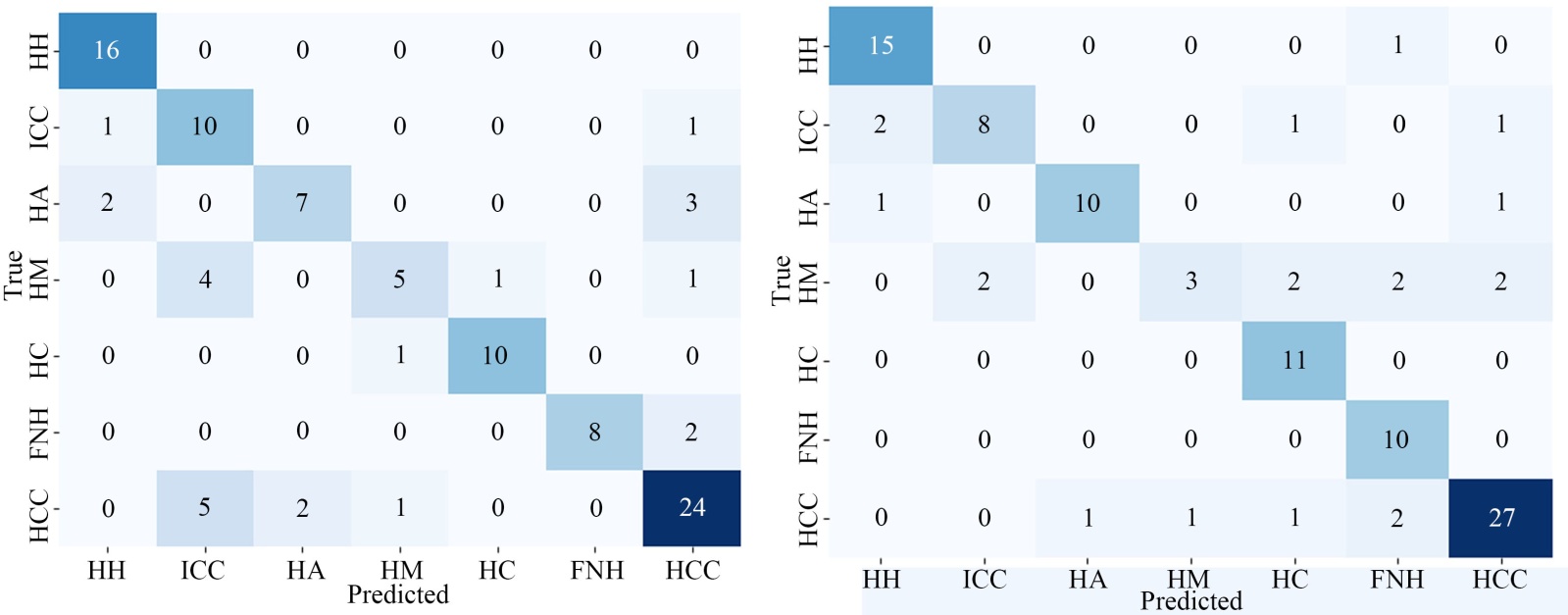 图4. 不同模型在肝脏肿瘤分类任务中的混淆矩阵对比