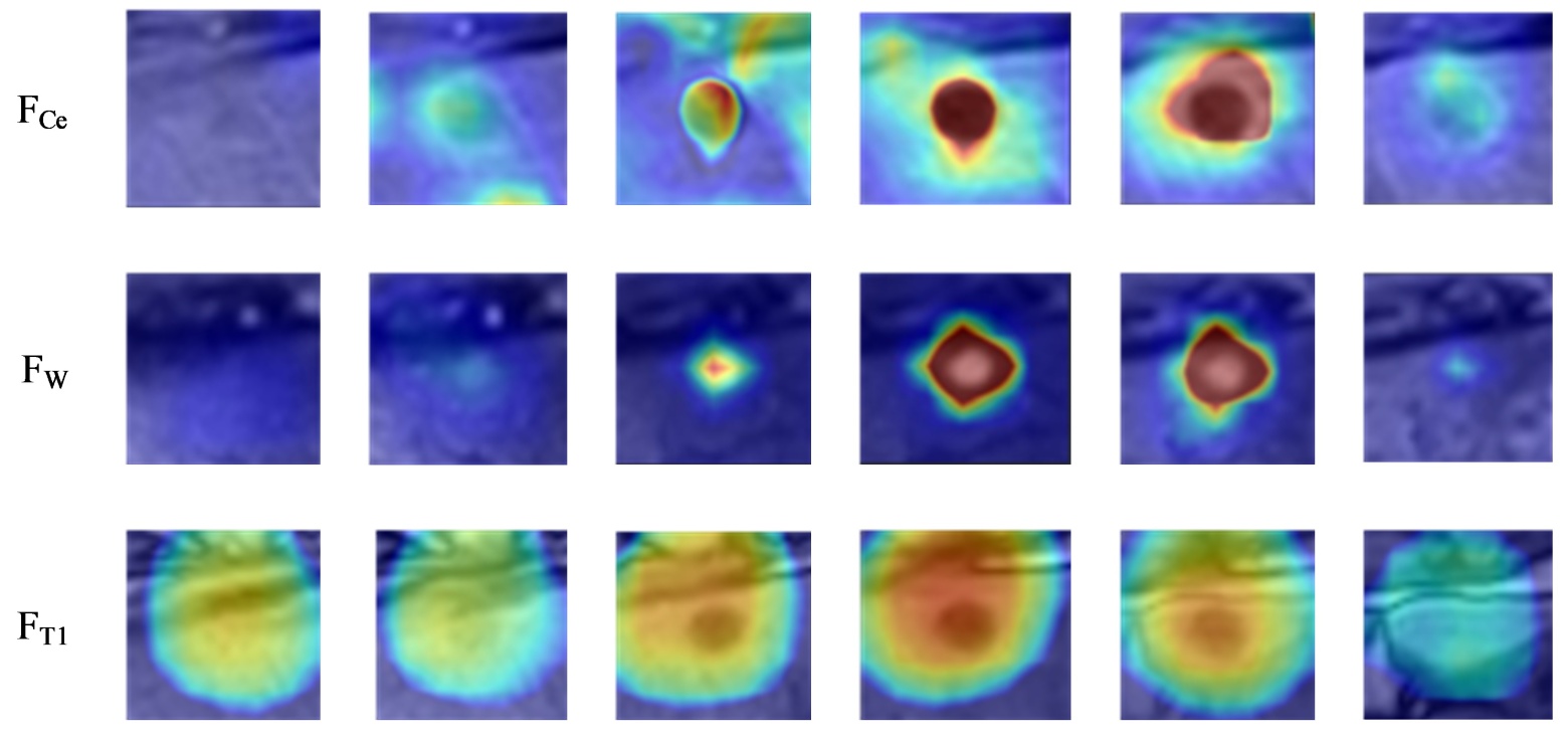 本研究利用梯度加权类激活映射技术生成了可视化热力图,以展示模型在三类关键MRI序列上的聚焦区域,增强模型的可解释性。如图7所示,热力图按行排列,自上而下分别对应动态增强MRI (Dynamic Contrast-Enhanced Magnetic Resonance Imaging, DCE-MRI)、弥散加权成像与T2加权成像的融合序列,以及T1加权成像的内外相位序列,从左至右展示了病灶区域的连续层面切片。