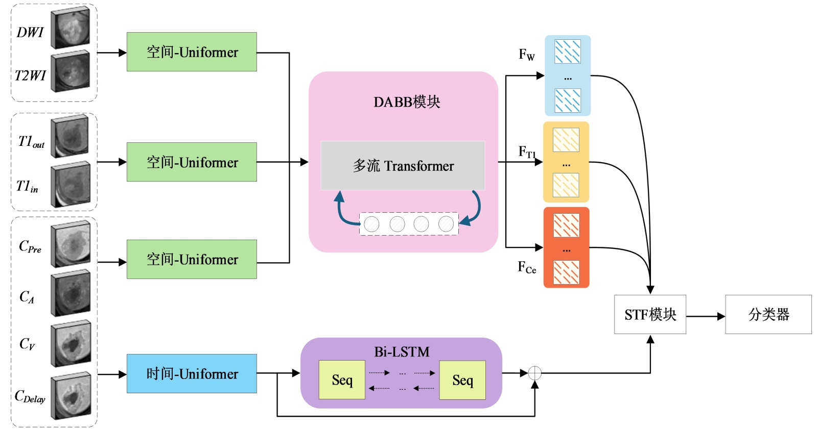 本文提出一种DSTF-Former方法,用于多序列MRI条件下的肝脏肿瘤分类,其整体框架如图1所示。该方法在多序列MRI中同时建模空间特征与时间动态信息,实现时空特征的协同学习。