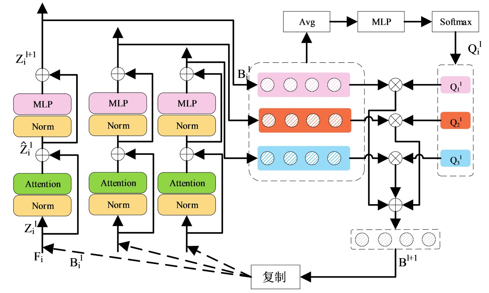 在该模块中,本文将所有跨通道注意力交互限制在这些瓶颈特征上。对于第l层,更新过程如公式(2)、公式(3)所示: