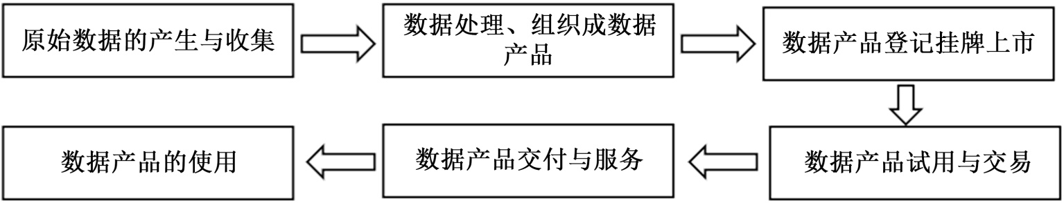 2) 明确数据的流通过程。数据确权需厘清流通过程中的动态权属关系,该过程本质上是数据资源在供给方与需求方之间伴随价值传递与安全信任的交换转移,涉及所有权、经营权、使用权、收益权等的让渡,且前三种权利可相互分离。从市场流程看,数据要素流通主要包括如图2所示的原始数据产生与收集、数据处理与产品化、产品登记挂牌、试用交易、交付服务及最终使用等环节。实践中,以数据主体是否改变为标准划分,更有利于明晰权利归属。完整追踪数据流转路径,方能依据流通中的行为痕迹、协议约定及合规要求,界定各主体权益,构建可验证的确权体系,为后续交易与合规审计提供基础。
