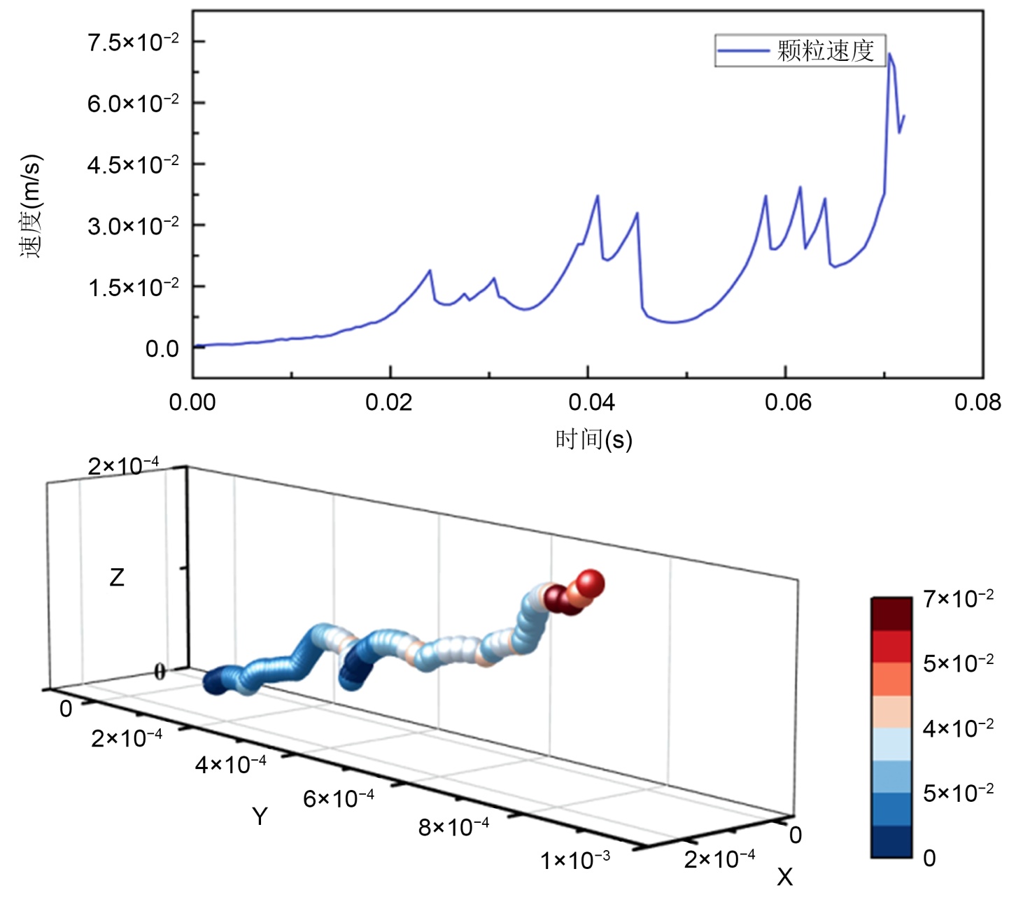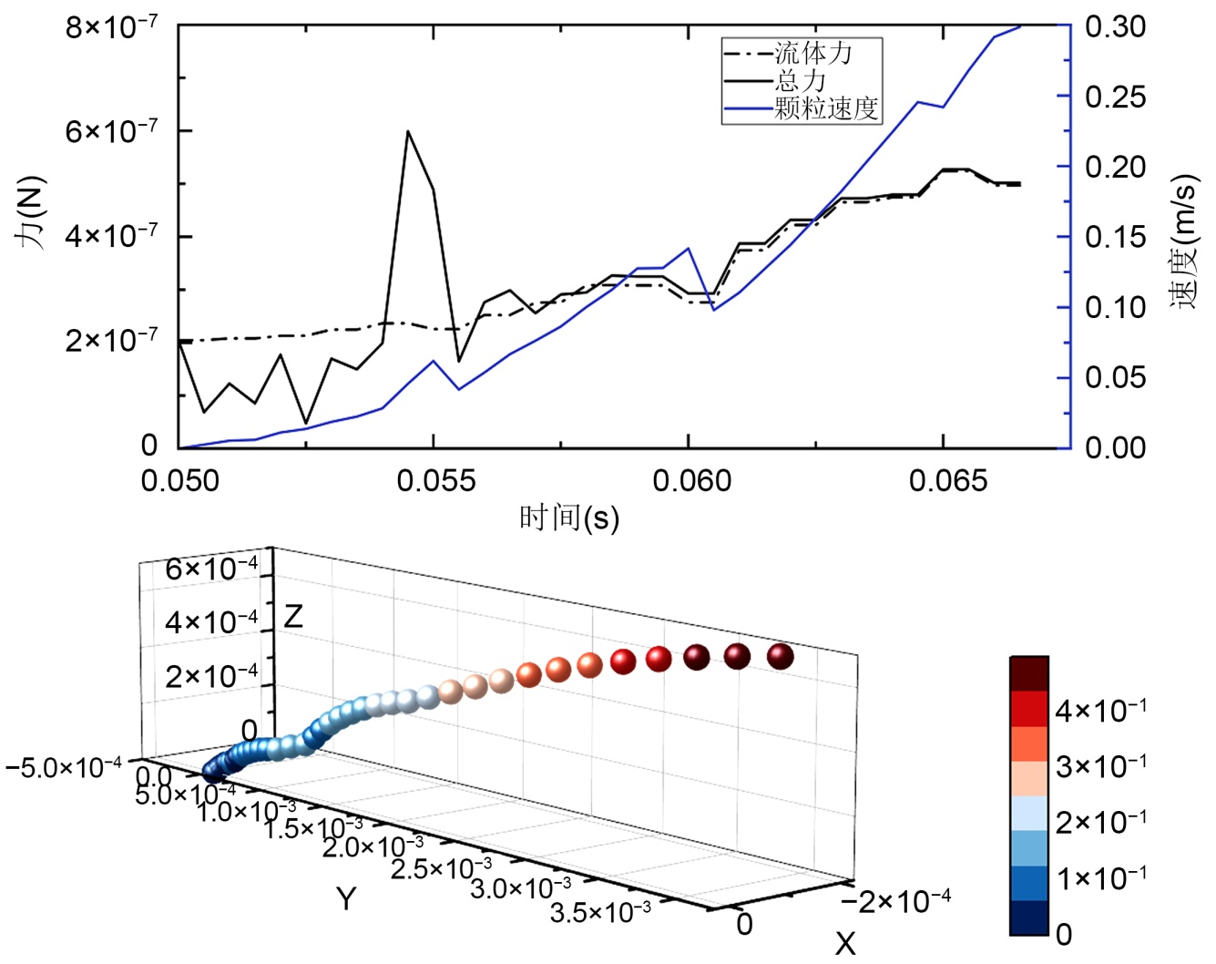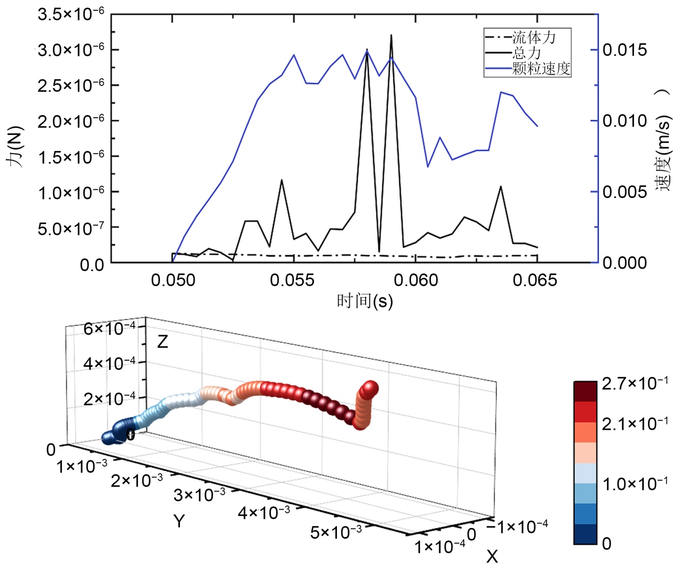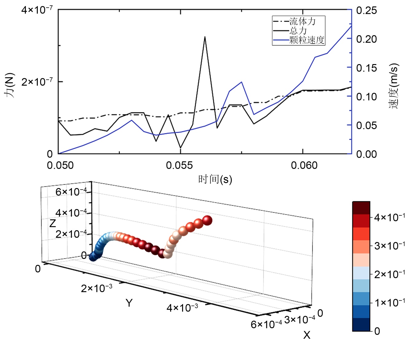 图4展示了目标颗粒在流体起动过程中的运动轨迹与其速度演变。从轨迹图可以清晰地看出,颗粒的运动并非一蹴而就,而是经历了明显的阶段性:初始的轻微晃动、沿床面的持续滚动,并最终在轨迹末端脱离床面实现起跳。对应的速度曲线则更为细致地揭示了这一过程的动力学特征:速度并非单调增长,而是呈现出阶梯式上升与瞬时骤降交替的复杂模式。