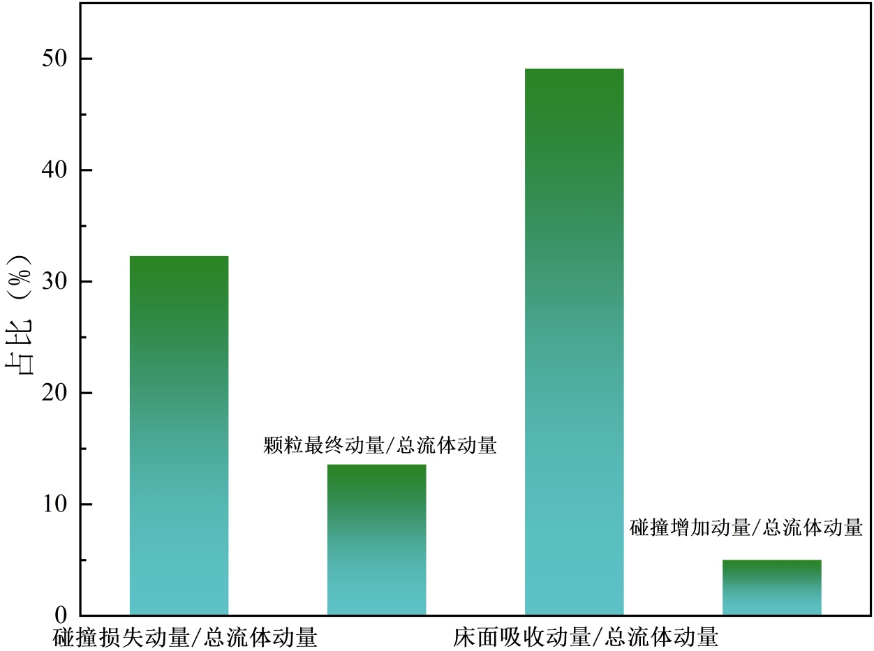 在图5中对颗粒动量的精细分析揭示出单颗粒流体起动与群体输运状态在碰撞动力学上的本质差异。在单颗粒起动场景中,颗粒与床面固定颗粒之间的碰撞主要起能量耗散作用,而非动量传递与起跳激励。每次碰撞均导致颗粒速度骤降,动量损失显著。这一机制差异清晰界定了稀疏颗粒流与饱和输沙状态下碰撞行为的物理本质。