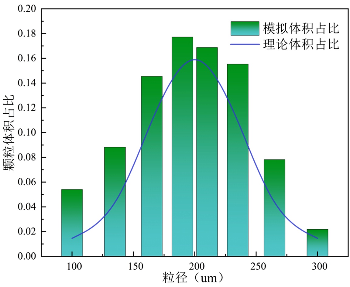 本章构建了对数正态分布床面以研究天然沙地的起动选择性。首先在计算域中创建了10,000个位置和直径随机的粒子,颗粒直径服从对数正态分布,平均值dp = 200 μm,标准差σp = 40 μm,颗粒在重力作用下经历自由落体运动,直至形成平静的沉积层。图6显示了模拟生成的床面不同直径颗粒的体积分数分布,细颗粒(135~180 μm)主要填充在粗颗粒间隙中,形成致密的屏蔽层。