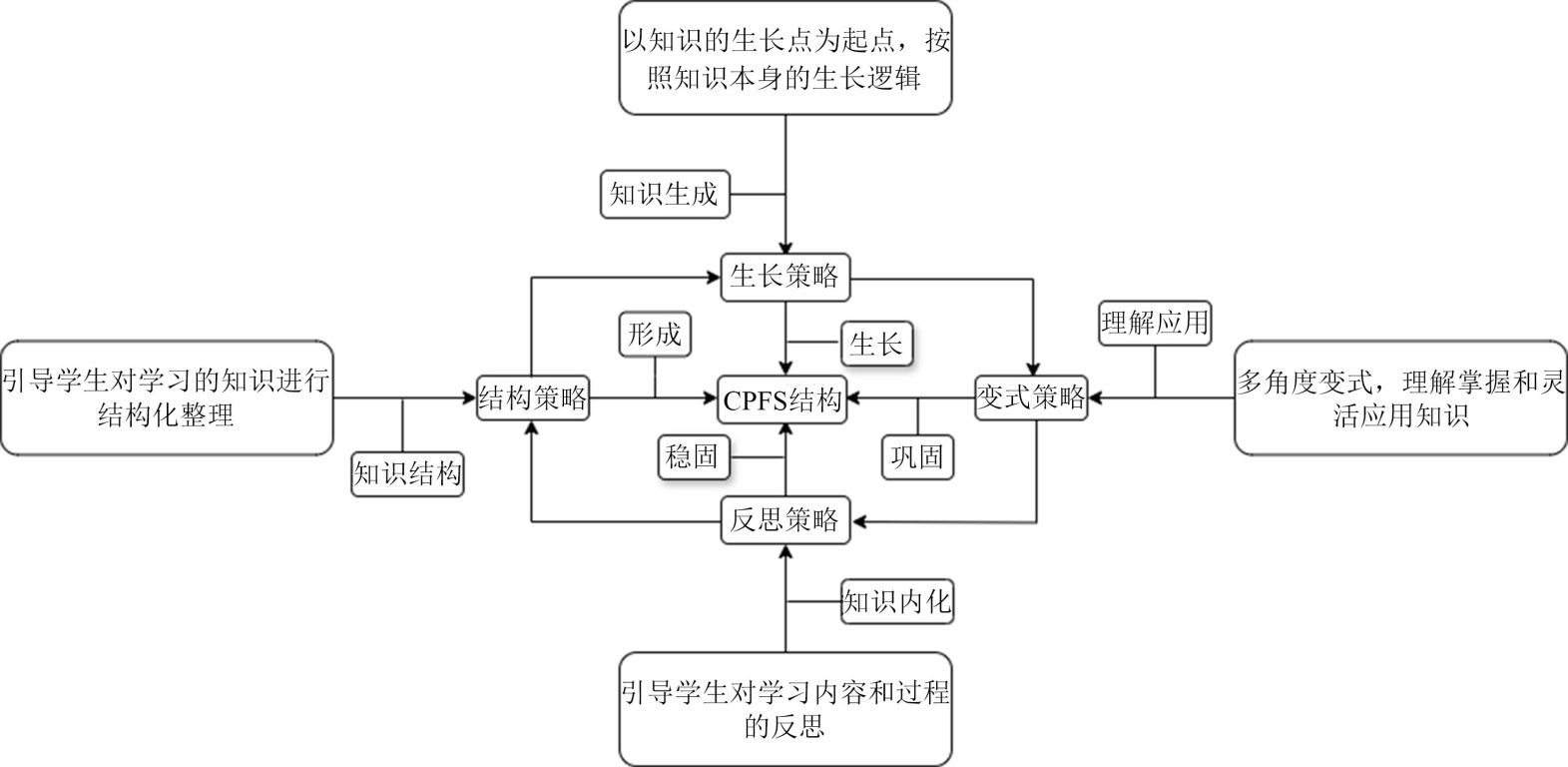 为了构建并且完善CPFS结构,喻平教授和鲍红梅老师提出了生长教学策略。生长教学策略指根据数学知识内部的生长机理,学生认知特点,从数学知识的生长点出发设计自然可信的模拟过程,引导学生主动参与数学知识的探索、发现、研究和发明,进而促使学生数学知识和认知结构的自然生长;其中,生长教学策略包括生长策略、变式策略、反思策略和结构策略[2]。CPFS结构是学生对外显的数学概念和命题知识进行内化贮存形成的网络,生长教学策略的4个子策略相互转化,使学生形成能灵活运用数学知识解决问题的CPFS结构(如图1所示)。