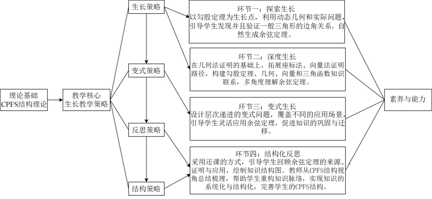以喻平教授提出的“CPFS结构”理论为基础,以生长教学策略为核心,设计余弦定理的教学。通过“探索生长–深度生长–变式生长–结构化反思”四个环节的递进式教学,以勾股定理为生长点,设置一系列关于余弦定理的问题链,引导学生从探究、证明、应用的过程中逐步构建余弦定理的CPFS结构,同时注重余弦定理的多元证明,深化余弦定理与勾股定理、三角函数、向量和解析几何知识之间的联系,并且设置关于余弦定理的变式题,不仅深化了学生对余弦定理的理解,而且还提高了学生对余弦定理知识的综合运用能力,最后结构化反思对知识点进行梳理,进一步完善了学生以余弦定理为核心的CPFS知识结构。通过帮助学生建立CPFS知识结构,促进学生头脑中形成良好知识认知网络[6],不仅深化对知识的理解,而且在运用知识解决复杂的问题时,可以快速地提取相关的概念、定理、公式等,提高解决问题的能力,培养学生逻辑推理、数学运算和数学建模等核心素养。因此,教师在教学设计的过程应聚焦于学生已有知识与新知的联结处,引导学生主动探究,同时帮助学生建立对知识的多维理解,避免知识的孤立与僵化,采用层次递进的变式训练,使学生在变化情境中把握命题的本质结构,进而使用结构化反思促进知识建构,通过知识梳理与图示呈现,帮助学生将零散命题整合为系统网络,提升知识可迁移性。