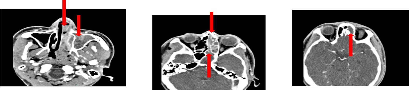 Figure 3. Non-contrast and contrast-enhanced paranasal sinus CT scan: The right nasal cavity-maxillary sinus involving the inferomedial orbit with thickened soft tissue of the nasal ala, suggestive of a neoplastic lesion