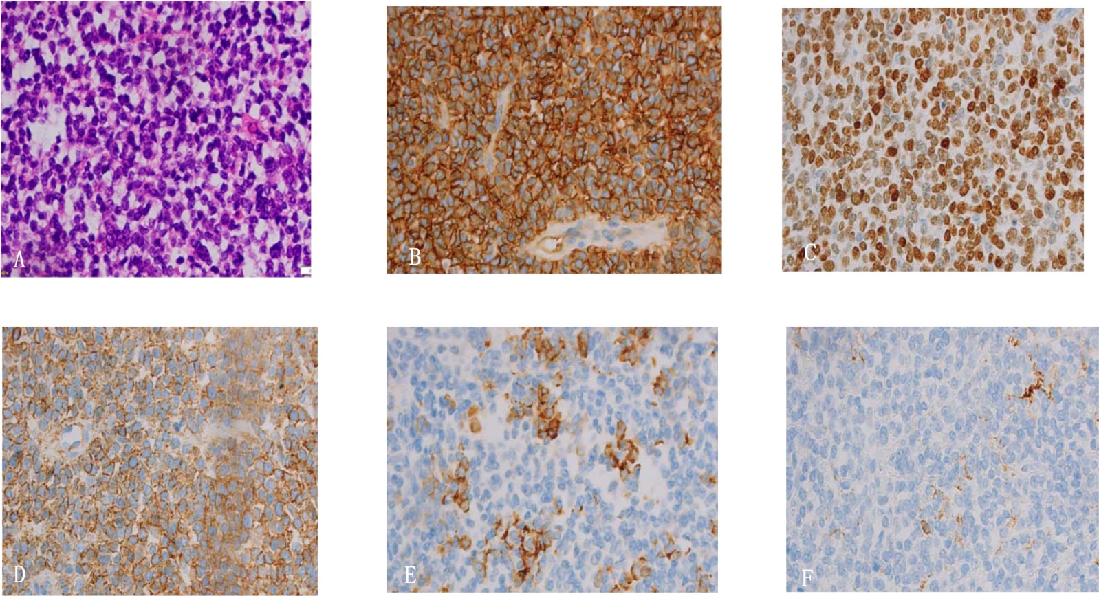 图4. 病理、免疫组化及原位杂交结果。(A) 小圆细胞肿瘤(HE ×40),(B)~(E) CD99(+),Fli-1(+),CD79a(-),Ki-67 (+, 60%) (IHC ×40),F原位杂交EBER(-)