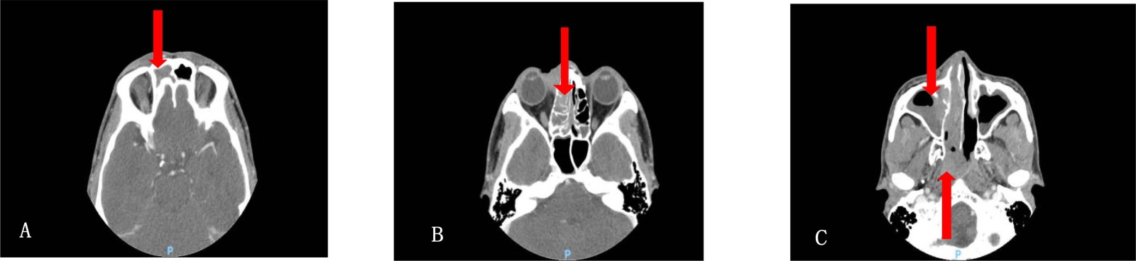 图3. 鼻部CT右侧鼻腔–上颌窦累及眼眶内下部,鼻翼软组织增厚,考虑肿瘤性病变