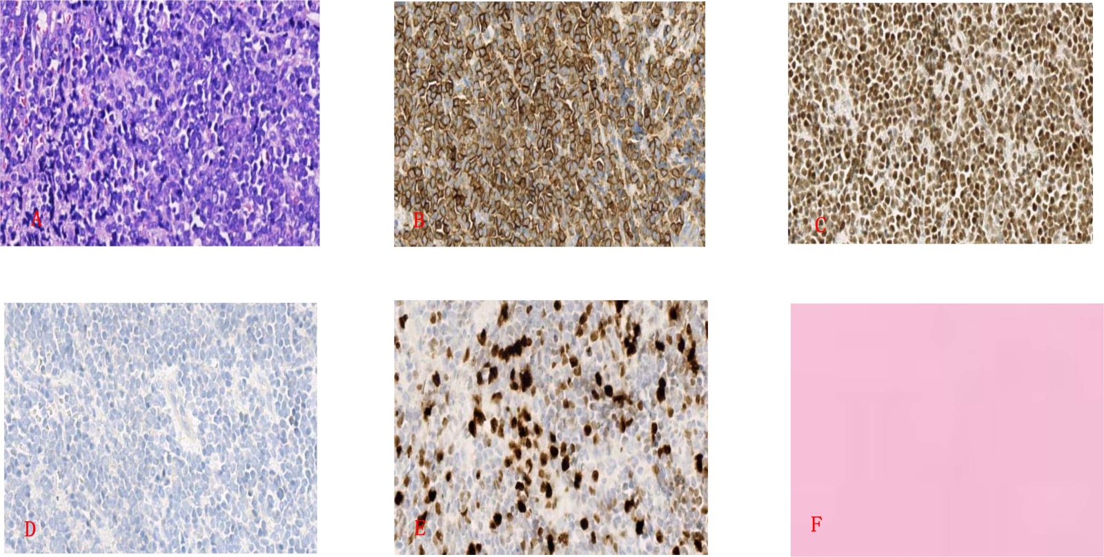 Figure 4. Pathological, immunohistochemical and in situ hybridization findings:(A) Small round cell malignant tumor (HE ×40); (B)-(E) CD99 (+), Fli-1 (+), CD79a (-), Ki-67 (+, 60%) (IHC ×40); (F) EBER(-) negative by in situ hybridization